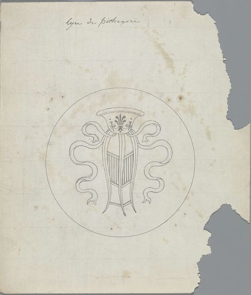 Curator: This intriguing drawing, titled "Le Tricorde et instrument epercettes [?] antique," comes to us from before 1828, created by Pierre Félix van Doren. It's rendered in ink on paper. I’m immediately drawn to the geometric simplicity. It's quite elegant, almost architectural in its precision. Editor: My initial reaction is of something fragile, a blueprint perhaps for a performance that never was. The lone stringed instrument floats in this perfectly circular space, like an artifact from a time when music carried very different meanings. Is there something known about van Doren’s role as an engraver of banknotes to this piece? Curator: The precision required for bank note engravings is evident in his art, and would indeed have influenced this composition. It evokes a sense of classical order. And, although in places the exactness seems compromised, the use of the circle suggests a complete system, a microcosm. Considering his place and time, this symbol resonates with the rise of revolutionary bourgeois political theory and ideas about liberty, while retaining visual forms associated with elite symbols of art, culture and taste. The title suggests an “antique” origin, too, implying not a representation but a recollection, not to mention its position relative to similar artworks made by this artist in sketchbooks or as preparatory drawing studies. Editor: True. Van Doren manipulates those fine lines beautifully, lending to the object both volume and depth while existing on the flattened page. The textures in those looped ribbons create movement as well. Is this academic attention to detail, like his approach to form and shadow, also an illusion? And what of its position on that damaged, irregularly shaped support sheet of paper? We can tell from this particular image's surface details that this work was itself part of an older, larger source, as a piece of discarded ephemera! Curator: That tension between order and irregularity certainly adds a layer of complexity. If you remove it from a purely formal exercise, the instruments depicted – the tricorn and whatever else this second, indefinable “tool” actually is – carry the echoes of ceremony and cultural power structures, both past and future. The meticulous draftsmanship reinforces a sense of idealized tradition, even while hinting at social changes to come, and those tears in the page disrupt any sense of stable or unassailable truths that form that academic world. Editor: It is fascinating how van Doren uses line to capture these contrasting elements—precision versus fluidity, classical design and revolution—and his unique material sensibilities serve as visual markers on its own art historical path through time. Curator: Indeed. "Le Tricorde et instrument epercettes [?] antique" gives us much to think about with regards to academic art and artistic technique.
