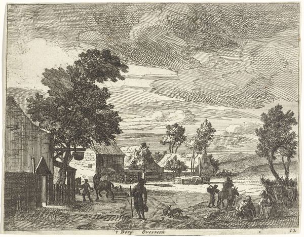 Editor: This is "Bauerndorf, ein Mann führt ein Pferd aus seinem Hof, vorne ein Hund," or "Village, a Man Leads a Horse out of his Yard, with a Dog in Front" by Theodor de Bruyn. It's an ink drawing, but undated. It evokes a very quiet, pastoral feel, like a snapshot of everyday life. What do you see in this piece that stands out from a historical perspective? Curator: I see a constructed vision of rural life. Notice the idyllic arrangement – the neat house, healthy animals, and seemingly content farmer. Consider the rise of industrialization at this time; images like this one served to romanticize rural existence, almost as a form of visual propaganda. Editor: Visual propaganda? That's interesting, I hadn't considered that. In what sense? Curator: Think about who was commissioning and consuming these images. Often, it was an urban elite. They likely had little actual contact with rural hardship, but this genre painting reassured them of a stable, even picturesque, countryside. It created a visual counter-narrative to the realities of poverty and agricultural labor which the artist perhaps never experienced themselves, or chose not to represent. Is this true "realism", or is it the construction of something else? Editor: So, the image isn’t necessarily an accurate reflection of reality, but rather a carefully crafted ideal? The charming dog in the front probably helped soften the blow, then. Curator: Exactly! It's a form of visual reassurance for a specific audience, masking potential social tensions with idealized imagery. These genre scenes gained popularity, shaping and solidifying beliefs and expectations. They help us trace how art served a public, and often political, purpose in portraying Dutch identity. Editor: That makes me look at it very differently! Thanks, it’s amazing how much history can be packed into a simple drawing. Curator: Indeed. Examining the cultural context really allows us to see beyond the surface and understand the artwork's complex relationship to society.