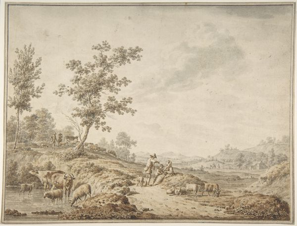 Editor: This is Egbert van Drielst's "Shepherd and Shepherdess near a Pool." It's a drawing, and it creates such a serene atmosphere. What can you tell me about its historical context? Curator: Consider how idealized pastoral scenes like this served the interests of the Dutch elite in the late 18th century. How might this image reinforce notions of a harmonious social order? Editor: So, it's not just a pretty picture, but also a reflection of the powers that be? Curator: Precisely. Think about how this idyllic representation of rural life contrasts with the social and economic realities of the time. Editor: It makes you wonder about the unseen stories, the ones not being represented. Curator: Exactly! Art often reflects what society chooses to value, and sometimes, what it chooses to ignore. Editor: I’ll definitely look at art differently now. Curator: That is the goal!