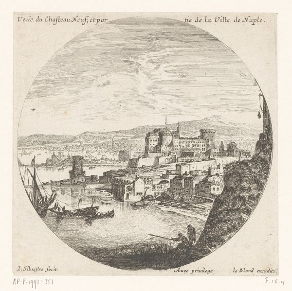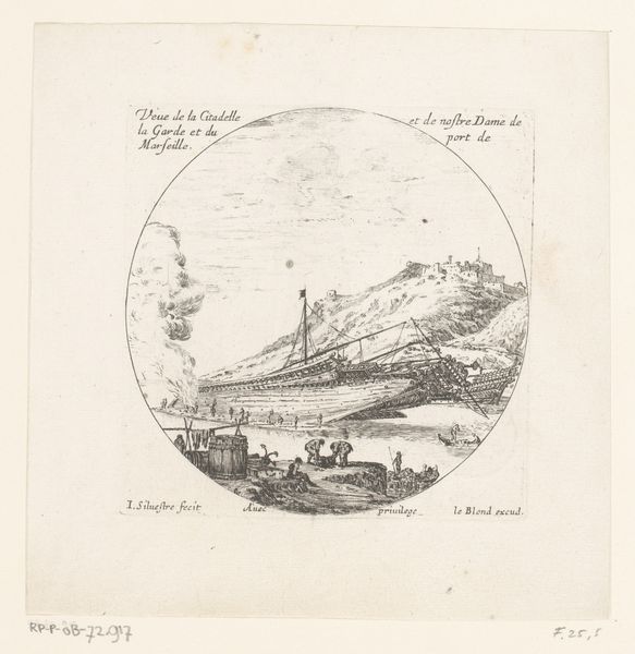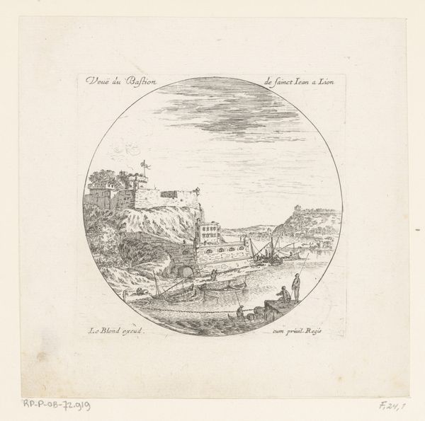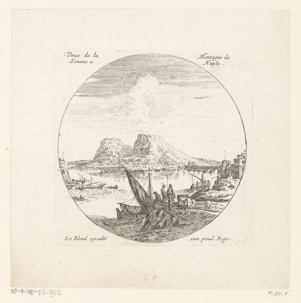 Editor: So, here we have "View of a Harbour with a Rock Formation in the Background," an etching and engraving by Israel Silvestre, made sometime between 1631 and 1657. It feels… industrious, yet somehow also calm? What jumps out at you when you look at it? Curator: You know, industrious *is* a great word. The bustle on the shore almost sings, doesn't it? And yes, a strange serenity. Silvestre really captures that Baroque fascination with dramatic landscapes tamed by human endeavor. The etching almost vibrates. Doesn't the texture make you want to run your fingers across that imposing rock? But, tell me, does the artist's hand feel removed from this to you at all, or can you sense their presence within this seemingly simple landscape? Editor: I do see his hand – it feels considered, deliberate. Not photo-realistic at all. How does that relate to the Baroque style, though? Curator: Good question! Think about what "Baroque" usually brings to mind – drama, movement, intense emotion. Here, Silvestre isn't giving us a tempest, but he *is* hinting at a grand, almost stage-like scene. That contrast between the natural world and humanity is where the Baroque sensibility emerges for me. It's like a theater set, only real. Editor: That makes perfect sense. It's not just a landscape; it's a *presentation* of a landscape, carefully curated. Curator: Precisely. It’s almost as if Silvestre is inviting us to ponder humanity’s role as both observer *and* participant, but in a wonderfully gentle way, don't you think? It gives me pause, considering the drama unfolding around us every day! Editor: I never would have looked at it that way on my own. Thanks. I'm going to try and remember that next time I visit the Rijksmuseum. Curator: Excellent! And maybe bring a magnifying glass. I hear that the microscopic brushstrokes can give us yet another peek behind the Baroque curtain!