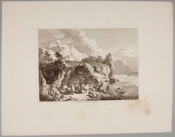 Curator: Adrian Zingg created this print, "Plate IV," sometime during his career, and we see it held now in the collection of the Harvard Art Museums. There isn't an exact date associated with the piece, but Zingg lived 1734 to 1816, so we know roughly when it was created. Editor: It evokes a sense of quiet travel, doesn't it? The figures feel small against that towering landscape, making me think about humanity's relationship with nature. Curator: Precisely. Zingg, along with other artists of his era, played a crucial role in shaping the visual language of the picturesque. It's important to consider the rise of landscape art in the 18th century and how it catered to the desires of an increasingly mobile elite. Editor: And who had the luxury of experiencing nature. The print raises questions of access and privilege inherent in landscape appreciation, doesn’t it? Curator: Absolutely. These prints often romanticized rural life while obscuring the realities of labor and social hierarchy that sustained these landscapes. Editor: It's a reminder that landscapes are never just landscapes; they're coded spaces loaded with social and political meaning. Curator: A vital point. This piece really opens up a fascinating discussion about the intersection of art, travel, and social structure. Editor: A reminder that we must consider how art mediates our understanding of the world.