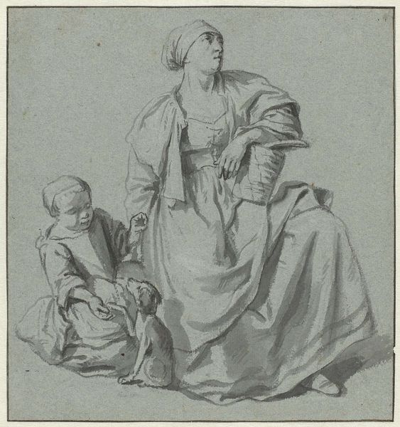 Curator: We’re looking at Jacob Ernst Marcus's "Zittende oude vrouw en twee kinderen" which translates to "Seated old woman and two children". It’s an engraving dating back to 1813. Editor: My first impression is of stillness, almost oppressive. The stark monochrome palette really enhances the sense of weariness etched on their faces. You feel the weight of their situation, especially in the posture of the sleeping woman. Curator: Absolutely. Note the artist’s technical skill in using line and hatching to define form and shadow, it's almost sculptural, particularly in the rendering of the old woman’s draped clothing and weary features. The formal arrangement of figures creates a triangular composition, drawing your eye around the characters in stages. Editor: From a material perspective, the creation of an engraving would involve skilled labor, specialized tools, and printing processes. Paper itself would have been a valuable commodity, and its role in distributing images of working-class figures like this speaks volumes about the dissemination of social commentary at the time. Curator: Interesting point. Consider how the print medium allows for multiple reproductions. Its distribution reaches a wider audience than a unique painting might, allowing for the potential replication of a shared emotional response across different socio-economic levels of Dutch society. Editor: These details – her patched clothing, the bare feet of the boy, and the worn bench are details not typically immortalized in artistic portraiture. They emphasize poverty and lived hardship. Marcus uses art as social commentary by elevating those on the fringes of society, and that’s important to how we understand art production at the time. Curator: Indeed. While not idealized, each figure is treated with dignity. The visual impact transcends mere social documentation, it evokes a palpable empathy. Marcus masterfully manipulated line and form to convey human experience in a complex social fabric. Editor: Looking closely reveals the level of labour involved in image creation, but the subject of the artwork alludes to a whole range of other forms of labour and to class struggle. Overall it’s a potent and compelling representation. Curator: Quite. We begin with lines etched into metal and conclude with lines etched onto faces, each a different method of engraving that tell the human condition in its various states.
