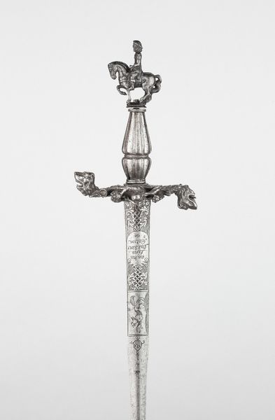 Curator: Before us, we have a smallsword, dating approximately to 1770-1780. You can find this remarkable example of decorative weaponry here at the Minneapolis Institute of Art. Editor: My first impression is one of incredible detail, even extravagance. Look at the intricacy of the hilt! The play of light and shadow across the metal is quite stunning. Curator: Indeed, the smallsword became a common fashion accessory for men of the upper classes. While still functional, the emphasis shifted toward elaborate design as a status symbol. Its role within societal displays of power should be further analyzed. Editor: Focusing on the material qualities, one sees how the metalsmith's craft elevates its very form. The curves and delicate latticework certainly invoke a baroque sensibility. Note the contrast between the smooth, almost polished areas, against the matte textures. Curator: The creation of such swords parallels an evolving socio-political structure, moving from purely militaristic tools to indicators of personal standing during this period. Display became part of wielding authority, which reflects evolving cultural values regarding male status. Editor: Beyond its role in power dynamics, I appreciate how its composition is more like an elegant dance. See how those swirling decorative elements around the guard echo patterns on the blade? It draws your eye down its entire length, activating it as pure visual design. Curator: It reminds me that we mustn't divorce objects like these from their performative role within history, not merely viewing them as sculpture. Swords have been laden with symbolic importance – a potent symbol representing much more than a refined cutting implement! Editor: Fair enough. But considered purely as an object, doesn't it strike you as something more abstract, almost transcending functionality? Look at how gracefully that cage of silver and steel encompasses empty space. The voids are as active as the metal itself! Curator: What this sword reminds me is how the social lives of objects intersect the story of shifting meanings around masculinity in Europe. Now I appreciate its complex interplay even further! Editor: And I agree—thinking of its role in portraying male authority and physical prowess through adornment, enriches what I observe through formal study. Quite remarkable.