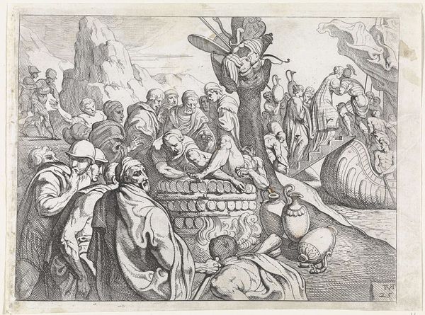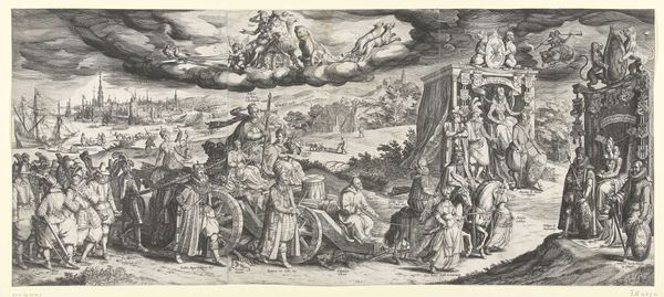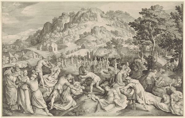 Editor: This is "Crucifixion" by Nicolaes de Bruyn. The print on a sheet of paper shows a landscape filled with people witnessing three crucifixions. There's a somber, almost theatrical feel to the staging. What historical perspectives can you offer on this work? Curator: Considering Bruyn’s historical context, how do you think the rise of printmaking influenced religious imagery and its accessibility to the public? Did this image change the public perception of religious figures? Editor: It's fascinating to think about how prints made such a powerful scene so widely available. It really democratized religious art. Curator: Exactly. The print became a crucial tool for disseminating religious and political ideas, reshaping cultural perceptions on a broad scale.