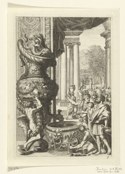 This is Jean Lepautre's "Fontein naar links gekeerd", a print of around 1660, now held in the Rijksmuseum. The composition presents a complex scene dominated by two elaborate fountains, around which figures gather in a grand, classical setting. The scene is intricately rendered, employing fine lines to create a sense of depth and texture, typical of the Baroque period. Lepautre uses a semiotic system to communicate status, where the fountains serve as signs of wealth. The structure suggests a visual dialogue about the nature of spectacle and power, reflecting philosophical inquiries into perception and representation. Consider the artist's use of line and form. The symmetry and detail are not merely decorative; they actively participate in a cultural discourse about luxury and design during the era of Louis XIV. The print challenges the viewer to consider how such displays were integral to constructing and maintaining social hierarchies.