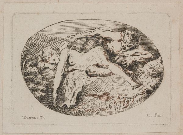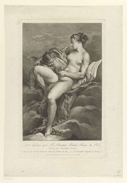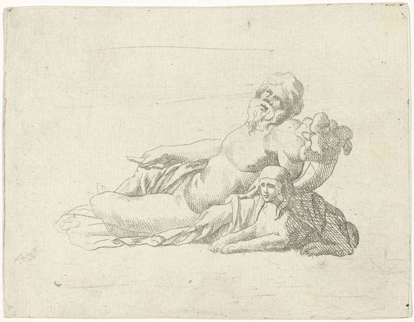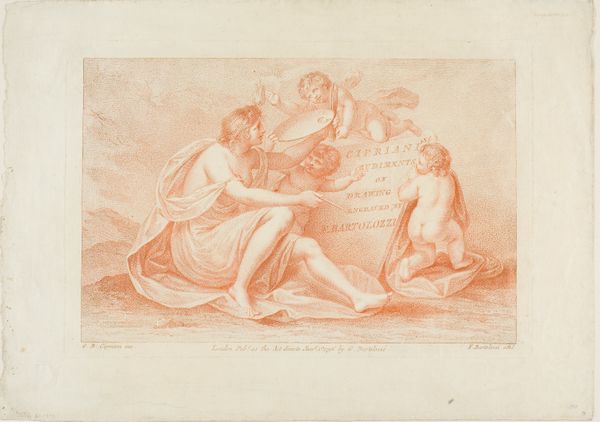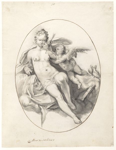This is Georg Melchior Kraus' "Venus and Cupid," a drawing held at the Städel Museum. Executed in sanguine, the artwork presents a warm, fleshy tonality that invites the eye to linger on its subjects. The composition, built on soft, curvilinear forms, directs our gaze across the reclining figure of Venus to the playful Cupid nestled at her side. Kraus uses line and shadow to define form, yet he avoids sharp, definitive boundaries, creating a sense of atmospheric softness. The sensuous curves of Venus's body and the delicate rendering of Cupid evoke a classical grace. This is tempered, however, by the artwork's engagement with the philosophical underpinnings of its time. The piece reflects the shift towards a more sentimental view of mythology, characteristic of the Enlightenment. The softness of line and tone serves not only an aesthetic function but also mirrors the era's emphasis on emotion and human connection. The drawing, therefore, exists as both a classical echo and a herald of modern sentimentality.