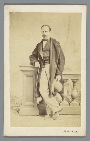 Curator: This albumen print, taken sometime between 1860 and 1885, is titled *Portret van een onbekende man*, or *Portrait of an Unknown Man*, attributed to a photographer named Gustave. Editor: The immediate impression is of a somewhat formal stillness. The tonality, sepia-leaning, casts the image with an air of faded nobility. The gentleman, while unknown to us, exudes an intentional composure. Curator: Indeed. The composition reveals a carefully arranged tableau typical of studio portraiture of that era. Observe the column in the background—a symbolic gesture lending classical weight to the sitter's stature. Also notice the man's placement relative to the ornate table; these details suggest societal aspiration. Editor: Speaking to that societal aspiration, notice how the clothing isn’t just functional, but performative. This photograph provides insight into how one wanted to be seen. In essence, these visual markers help define the historical narrative itself, illuminating a small facet of bourgeoise values within 19th-century culture. Curator: Precisely! The semiotics of dress, the careful arrangement of the pose—they all serve as signifiers, don't they? I am especially drawn to the textural elements present; notice how the surface grain affects not only the subject but also the way light reflects and interacts with form and space in ways painting simply cannot. Editor: I find it remarkable how something created to immortalize and aggrandize an individual has become an instrument by which later generations glean glimpses of an all-but-lost world, the everyday lives and aspirations of men like him, and how society wanted to memorialize them. Curator: Well said; the convergence of subject and surface truly evokes the spirit of a time, capturing not just likeness but also essence, and perhaps something far more ethereal too. Editor: A fascinating convergence that enables reflection far beyond simply art aesthetics, revealing a complex dance between the individual and sociohistorical tides, so to speak.