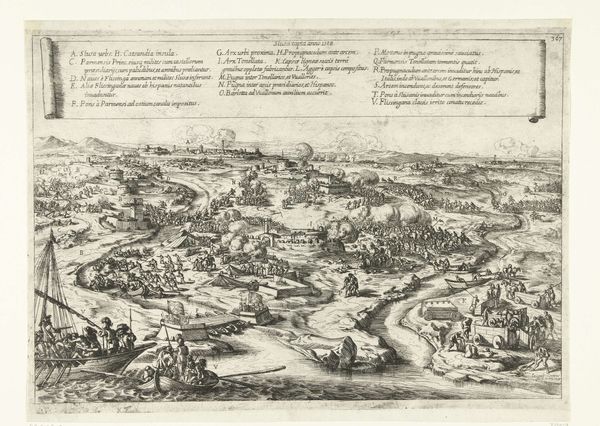 This is a small anonymous print, made around 1600, depicting The Battle of Nieuwpoort. This image serves as a fascinating window into the visual culture of warfare and political propaganda in the early modern Netherlands. The print illustrates a pivotal moment in the Eighty Years' War, a conflict that defined the Dutch Republic's struggle for independence from Spanish rule. Created for a mass audience it presents a bird's-eye view of the battle, crammed with marching armies. The image creates meaning through visual codes, emphasizing the scale and chaos of the conflict, but most clearly conveying a sense of the Dutch army's ultimate victory. Prints like these played a crucial role in shaping public opinion and fostering a sense of national identity during a time of intense political and religious upheaval. To fully understand the print, we might consult contemporary military histories, political pamphlets, and other visual sources that shed light on the complex social and institutional contexts in which it was produced and consumed.