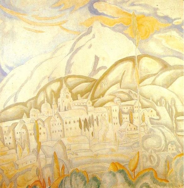 Spyros Papaloukas painted this view of Skete of Agios Andreas with oil on canvas. The first thing I notice is the process, how the paint is put down, not in a thin glaze but with real presence. I'm fascinated by the texture. It seems Papaloukas built up the image with lots of layers, almost like drawing. See how the paint isn't trying to trick you into thinking it’s a real mountain or building? It’s paint doing its thing, creating shapes. I'm drawn to the sky and mountain at the top of the picture. The blue lines around the clouds, the peach colour bleeding through... it’s like the whole landscape is breathing. And then those gold buildings clustered together, so solid and warm against the cool blues and whites. This reminds me a little of El Greco’s Mannerist landscapes, full of drama and spirituality. But Papaloukas brings his own modern vision, reminding us that a painting isn’t just a picture, it’s an experience, a way of seeing the world anew.