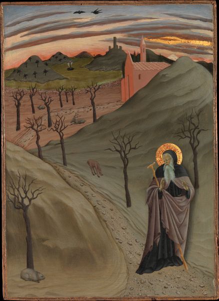 Curator: Here we have Lorenzo Monaco's "Saint Francis Receiving the Stigmata," a tempera painting dating back to around 1420. It captures a pivotal moment in the life of St. Francis. Editor: It’s surprisingly… intense. I mean, it's small, intimate almost, but that stark landscape and the figure of Francis, so vulnerable yet reaching...it feels otherworldly, and even quite unnerving. Curator: Precisely! Monaco masterfully employs the landscape to amplify the spiritual drama. Notice the angular rock formations—they're not just scenery; they're active participants in the scene, pointing towards the divine light emanating from the seraph. Editor: And that seraph—crimson, winged, bearing the stigmata itself. It's almost jarring against the otherwise muted palette. It demands attention; it’s clearly the crux of everything that's happening. Curator: The use of color, as you point out, is quite strategic. The red draws our eye upwards and underscores the miraculous nature of the event. The gold leaf, prevalent in the background, reinforces the heavenly realm that intersects with Francis's earthly existence. I also find Saint Francis's pose interesting, it conveys acceptance, fear, maybe? Editor: There is definitely something dramatic there. The dramatic quality really contrasts with the composition, there is a great degree of flatness, of almost two-dimensionality in the painting. In my view, what defines the artistic vision here is the choice to not emphasize three-dimensional modeling through lighting, so what remains are abstract patterns. The geometry in those robes and those jagged mountains feel essential for its effect. Curator: Absolutely, the painting beautifully balances the narrative with a sophisticated understanding of composition. There is a devotional depth but also a certain elegant surface beauty which is quite specific of the moment of transition from Gothic to Renaissance. Editor: Considering how seemingly simple and almost quaint its visual language is, it evokes quite a potent mix of awe and disturbance. Curator: Yes. Monaco has gifted us a window into a profound spiritual experience. Editor: A truly visionary interpretation of divine encounter indeed.