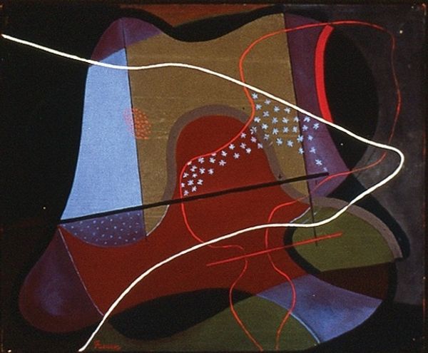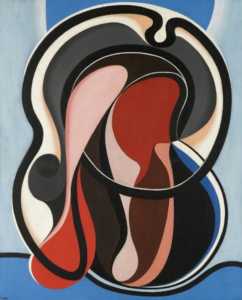 Editor: Here we have Georges Valmier's "Eve," painted in 1930. It's an intriguing painting with abstract forms that vaguely suggest a figure. It strikes me as quite dreamlike, almost surreal. What do you see in this piece? Curator: It's interesting that you use the word dreamlike, because for me, the layering of geometric abstraction and figuration in "Eve" reflects the social anxieties of its time. The 1930s saw a lot of shifts in cultural norms. Does the title "Eve" guide your interpretation? Do you consider her as the biblical character, or maybe an idea? Editor: I initially considered the biblical reference, but the abstraction makes it hard to stick with that interpretation. Perhaps the "Eve" is more of an exploration of form? Curator: Exactly! Consider how Valmier plays with Cubist fragmentation and Art Deco's streamlining. It's not just about depicting a woman, but about challenging conventional representation of women. Look at how she’s deconstructed and rebuilt. Can you sense a dialogue around female identity that moves away from patriarchal representations of women as either virgin or seductress? Editor: That's a fascinating way to look at it. It’s like Valmier is grappling with redefining femininity through abstraction, breaking down these outdated ideas about how women are "supposed" to be. The geometric shapes don’t offer easy answers, but invite inquiry. Curator: Absolutely. It's a testament to how art can participate in broader conversations around gender and identity. It makes you think about representation. Editor: I see it now. I had approached "Eve" as purely formal, but understanding its cultural context reveals a whole new dimension. Curator: Precisely! Art's true power often resides in its ability to mirror and question the very society from which it emerges.