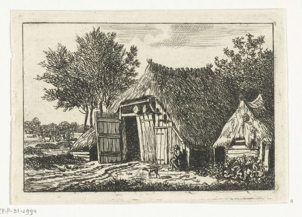 Curator: This etching by Louise Ravn-Hansen, titled "Street in Jægersborg," made between 1882 and 1883, depicts a quiet, somewhat obscured view into a Danish town. Editor: It feels almost secretive, doesn’t it? The dark, close hatching gives the scene an intimate and, dare I say, slightly claustrophobic air, like peering into someone's private world. Curator: Absolutely. Note how Ravn-Hansen uses line to evoke texture – the rough stonework, the feathered chickens, the tiled roofs. These details contribute to a sense of authenticity. Etching was experiencing a revival at the time. What associations would this image style carry for the people of its time? Editor: Knowing its place in time brings further questions; Jægersborg, then a small village, now suburban sprawl. An etching like this—was it a commentary on encroaching modernity or perhaps an elegy for a disappearing way of life in late 19th-century Denmark? Genre scenes, everyday encounters were a hallmark of social realism and impressionism that challenged the norms of earlier art production in European cultural centers, like Paris, by showing what really went on around them, instead of romantic fables of courtly elites. Curator: That's a keen insight. Considering its display within the Statens Museum for Kunst (SMK) today, we must also reflect upon its journey. From a probably underappreciated print during its production to the canon of Danish art history and its cultural representation in our present day, a symbolic echo chamber of sorts. The open barn door—almost a portal—what narrative possibilities does it unlock for the viewer? What does that opening do for chickens, and, more importantly, the figures lurking in the shade beyond? Editor: And what's compelling is how those figures, possibly women, fade into the background. It speaks to women's often-marginalized roles. Were their existences equally disappearing in a changing societal structure? The chickens could then almost act as emblems for this precarity! Or, dare I suggest, were chickens metaphors for those human inhabitants confined to the spaces "between" and at the edges of the image? Curator: Such powerful potential in what at first seems a simple street scene. Considering that Louise Ravn-Hansen herself negotiated the landscape of a male-dominated art world, it's not a leap to connect her vision to these larger social commentaries. Editor: Indeed, the power of a single image. From architectural texture to social text—there’s more depth than meets the eye, encouraging a reimagining of its original context through contemporary sensibilities. Curator: I agree entirely, the image's resonance across time invites endless conversations, solidifying its place as a relevant piece for continuous consideration.