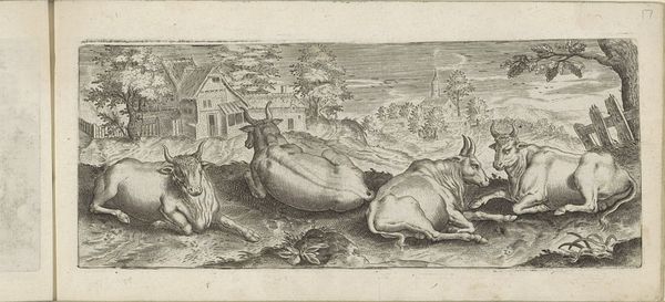 Curator: Here we have a remarkable engraving, "Apen, koe en buffel in een landschap," created in 1583 by Marcus Gheeraerts the Elder. Editor: It's certainly odd! A curious grouping of animals depicted in what looks like the middle of nowhere. There's a palpable sense of unease emanating from it. Curator: Indeed. Let’s begin with the technical aspects. Gheeraerts employed meticulous detail, evident in the precise cross-hatching which creates the tonal variations. Notice the textural differences he achieves between the fur of the animals and the smoothness of their hides. The composition has a horizontal emphasis with everything neatly arranged. Editor: Yet the spatial relations are strangely flattened, heightening the sense of artificiality. Why these particular creatures? Are the apes and buffaloes purely aesthetic choices? One could propose it speaks to the beginnings of early imperial encounters and taxonomic categorization during the Early Modern period, where new territories and species came into increasingly close proximity... represented, that is to say, in the microcosm of the composition. Curator: Possibly, but consider also the allegorical potential. The monkey figures were often symbolic, appearing in numerous works of this period. What reads as a simple landscape could, in fact, allude to complex moral narratives. Editor: While you analyze form and historical allegory, I see questions about our relationship with nature and how that's intertwined with social, historical, and perhaps violent encounters with "new worlds." The castle looming on the horizon…does it not signal a fortress of sorts, as civilization begins to encroach the wilds? Curator: It might suggest that, though I would want more visual support. Either way, it presents a fascinating case study in the function and representation of early engravings. Editor: Absolutely. It shows us that, even within what might appear straightforward on the surface, there lies an entangled world of narratives worth interrogating, both then and now.