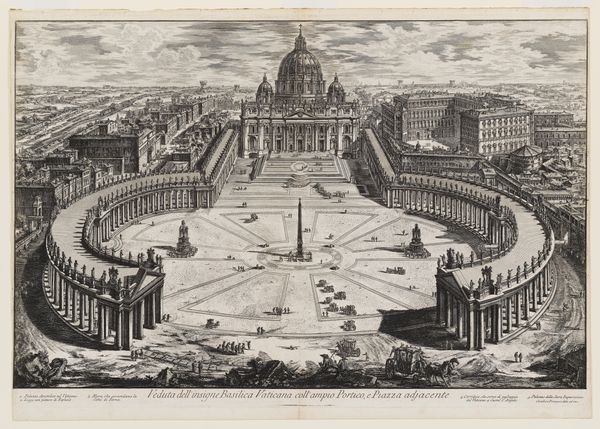 Curator: Here we have a print titled “Sint-Pietersplein,” created sometime between 1649 and 1740. It depicts St. Peter’s Square in Vatican City. My initial impression is one of incredible detail. The precision of the lines in the engraving and architecture is breathtaking. Editor: The materiality of the engraving highlights a deliberate and systematic approach. It also brings to my attention that the act of creating the image itself requires tremendous skill, precision and repetition, like bricklaying. Think about the socio-economic dynamics behind this. Who were the skilled laborers crafting this, and what position did their craft occupy in 17th-century Rome? Curator: It is worth remembering that this image emerged in a period when the papacy was actively engaged in solidifying its power and projecting its authority through magnificent architectural projects like St. Peter’s Square, which we can observe in its Baroque splendor, born of the Italian Renaissance. How does this representation then shape, or perhaps control, the reception of the Vatican’s power? Editor: True, these urban-scale projects would require equally grand access to construction materials. Where did the raw materials for the actual architecture come from, who mined the stones, and what were the labor conditions? The very land is appropriated for this expression of power and this print becomes part of that production. Curator: Precisely, consider the symbolic significance. The vastness of the square, the colonnades embracing it… everything communicates a sense of the Church's encompassing reach. Think about Bernini’s vision for the architecture itself. He aimed to create a space where people could gather and be embraced by the church. The print further disseminates this visual and political messaging. Editor: The labor embedded in every stage—from quarrying and construction to printmaking—becomes almost invisible when presented as a finalized image of divine power. It brings up a broader concern of whether the "cityscape" genre, which we see displayed in this print, is equally part of the legitimization of the built and social environment as any royal portrait might have been. Curator: That’s a compelling perspective. It reminds us to question the narratives these images propagate. Editor: It's a print that makes us reflect on power structures and the act of visualizing them. Curator: A testament to the intersection of art, politics, and material realities.