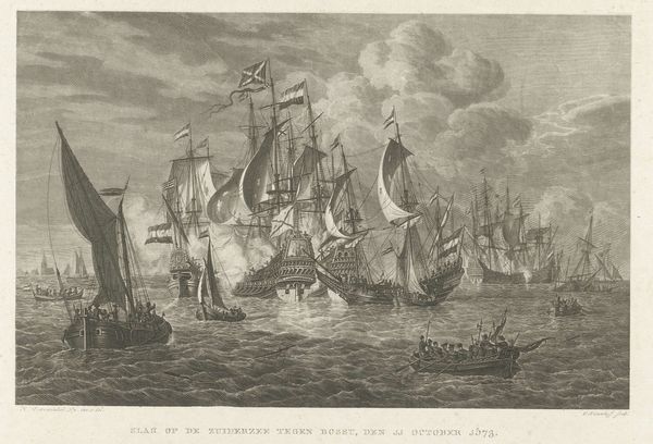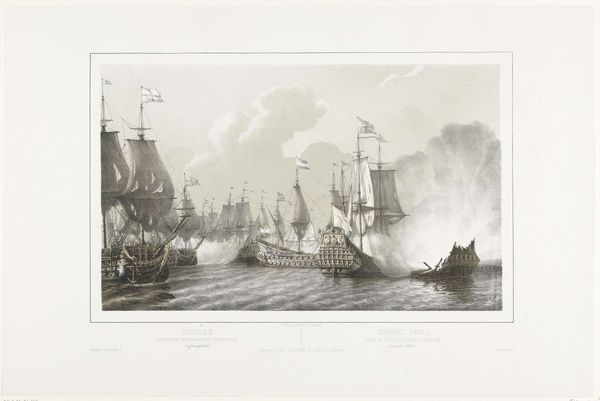 Editor: This engraving, "Vierdaagse Zeeslag, 1666," by Hendrik Vettewinkel, made between 1853 and 1861, plunges us right into the thick of a naval battle. It feels very dynamic, like a frozen moment of chaos and I am really intrigued by the boats in the foreground seemingly detached from the battle. How do you interpret this work? Curator: This print, made almost two centuries after the Four Days' Battle, invites us to reflect on the construction of national identity. What does it mean to commemorate a naval conflict, particularly one as complex and fiercely contested as this one? Consider that the Dutch Golden Age, with its maritime power, was already receding into the past. What narrative is Vettewinkel crafting, and for whom? Editor: That's a great point! The Golden Age was seen differently depending on where you stood, I assume. The smoke from the ships makes me think of erasure. Do you think the artist tries to say something about it? Curator: Exactly. This isn’t just about ships and cannons; it's about power dynamics, the economics of colonialism, and the human cost of these conflicts. How might the experience of those on the ships versus, say, enslaved populations in colonized territories shape their understanding of the ‘glory’ of such battles? And who were these engravings made for? To celebrate elite victories? Or to remind the rising bourgeoisie of a fabricated past? Editor: So, we're questioning the whole premise of "historical painting" then, as it may conceal complex social histories of colonial violence. This has really pushed me to think beyond the surface and consider how historical art serves different agendas. Curator: Precisely. The image prompts critical questions about whose stories are amplified, and at whose expense. Remembering historical context can reveal power structures, prompting reflection on history's impact on our contemporary world.