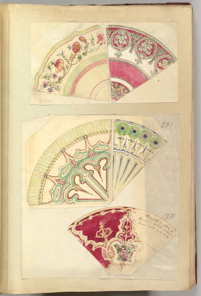 Alfred Henry Forrester created this watercolor sheet of plate designs in the 19th century. The designs command attention through their circular format, which presents a duality: part functional blueprint, part aesthetic exploration. Each design uses symmetry to create a balanced composition, yet this balance is disrupted by variations in color and pattern, which creates a playful tension between order and chaos. Forrester employs a limited palette with pastels and bold red, enhancing the decorative quality and challenging the traditional hierarchy between fine and decorative arts. The patterns oscillate between the organic and the geometric, suggesting a dialogue between nature and design. Ultimately, the formal arrangement of these designs on a single sheet encourages us to consider the relationships between them, and their function within design and artistic expression. This juxtaposition destabilizes fixed meanings, and prompts ongoing interpretation and re-interpretation.