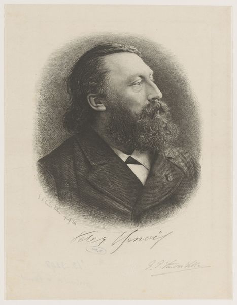 Editor: We’re looking at a portrait today— "P. C. Skovgaard," from 1875, crafted by Carl Leonard Sandberg. It’s an engraving, and I’m immediately struck by how…stark it feels. All these fine lines creating detail. What stands out to you? Curator: It's interesting you mention "starkness". Consider the context: portrait engravings like this circulated widely in the 19th century through illustrated magazines and books. They were vital tools for image dissemination and shaping public perception. How do you think this accessibility impacted Skovgaard's reputation as a landscape painter? Editor: I hadn't thought of it that way. So, was this a deliberate strategy to build his brand, so to speak, outside of gallery walls? Curator: Precisely. Think about the institutions that usually define "art" - academies, galleries, wealthy patrons. Sandberg’s engraving bypasses some of that, bringing Skovgaard directly to a wider audience. It also presents him in a certain light. What does the portrait communicate about Skovgaard the *person*, versus Skovgaard the *artist*? Does Sandberg perhaps want us to read his artistic character through his face and dress? Editor: Well, his serious expression, combined with his professional attire, suggest respectability and dedication. It creates a persona just as carefully as any painted portrait in a gallery. And it allowed wider consumption. I’m now rethinking who got to *own* art in this period and how. Curator: Exactly. Sandberg's print democratizes access, and reveals how power circulates beyond formal art spaces. Consider that Sandberg was engraving to help establish an artist who defined "Danishness" and its relationship with its land at a moment of massive change in national identity, the public role of such prints is critical. Editor: That's fascinating! Thanks; I hadn’t considered the socio-political impact of reproductive prints like this before. It offers a new perspective of our current ideas about art and representation.