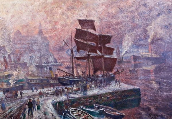 Editor: This is Claude Monet's "Boats on Repair," painted in 1873, rendered in oil. The mood seems almost industrial, with the focus on labor and the worn surfaces of the vessels. What strikes you most about it? Curator: Well, it’s fascinating how Monet highlights the material reality of shipbuilding and repair. Consider the chipped paint, the visible brushstrokes implying texture—it’s a world away from idealizing maritime grandeur. Think of the laborers too – are they part of the "machine" or actively resisting their own exploitation through acts of everyday labor? Editor: That's a perspective I hadn't considered. I was focused on the pure aesthetic qualities and the composition, but the painting seems to focus our attention on the work that maintains the ships, and what role this art plays in showing that labor. Curator: Exactly. And it challenges the traditional art hierarchy. Landscape paintings were acceptable but typically ignored the hands of the worker. Monet's deliberate inclusion disrupts this by illustrating the materiality of labor that supports the maritime economy. It also questions what it means to make "fine art" out of scenes of working people. Editor: So it's not just about boats; it's a commentary on production, the tools of that production, and even consumption in some sense. Curator: Precisely. What does it mean to buy a product of labour from the working class when you ignore what went into that "product"? Editor: It makes me see Impressionism in a completely different light – beyond just capturing light and atmosphere. Thank you. Curator: Indeed, understanding art through the lens of materials and labor helps us unpack so much about the society that produced it, not just the aesthetic sensibilities.