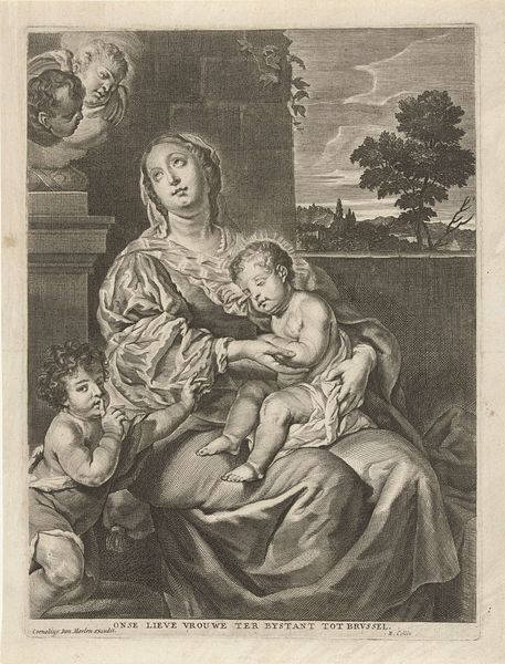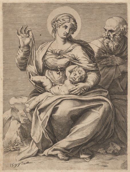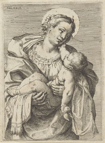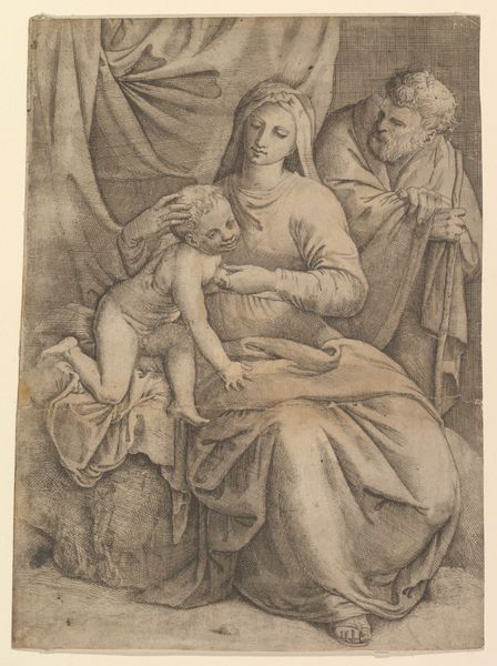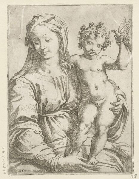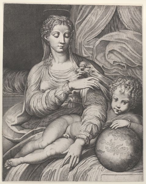 This engraving, made by Giulio Bonasone around 1510-1576, depicts the Virgin and Child seated beneath a tree. The Madonna's tender gaze and the infant Christ's playful interaction with a bird invite contemplation on themes of maternal love and divine innocence. Note the apple tree looming over the figures, echoing the story of original sin in the Garden of Eden. Yet, the presence of the Virgin and Child transforms this symbol from one of human failing to one of redemption. The Madonna, often referred to as the "New Eve," embodies a reversal of Eve's transgression through the birth of Christ. Consider the bird in Christ's hand, a recurring motif in Renaissance art symbolizing the soul. We see similar avian symbolism in ancient Greek depictions of Eros, the god of love, often portrayed with birds, embodying the soul's yearning for the divine. This image resonates with the complex interplay between classical and Christian symbolism, and the cyclical return of ancient motifs, laden with new significance, throughout art history. It serves as a potent symbol of salvation, love, and the eternal cycle of life, death, and rebirth.