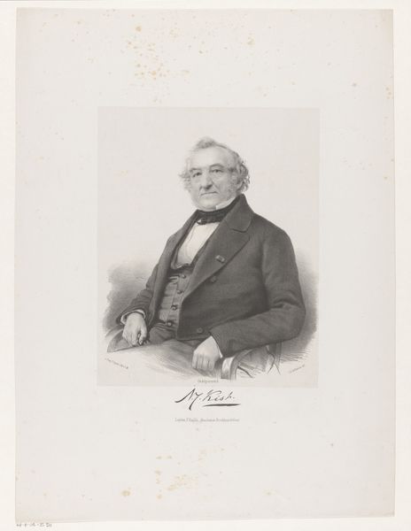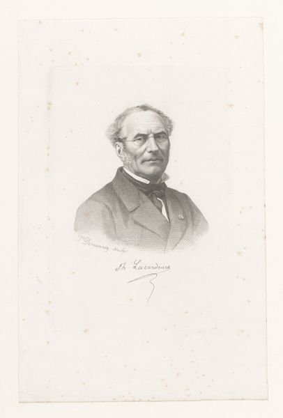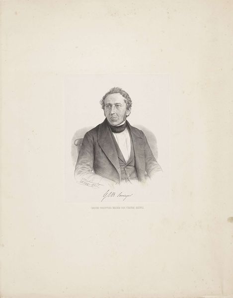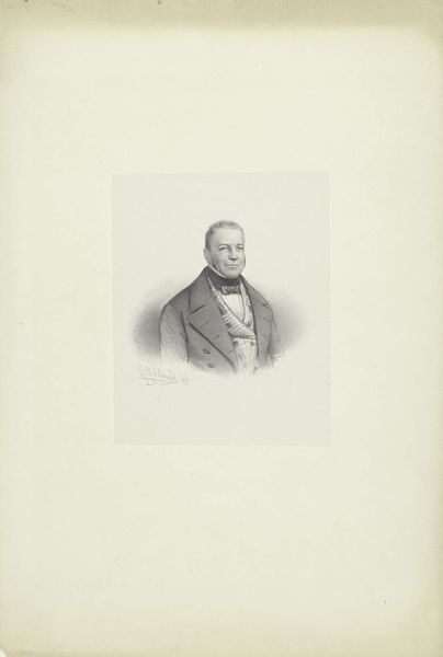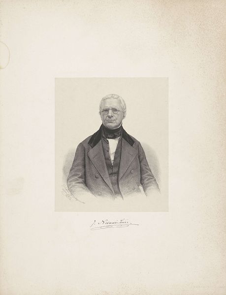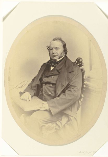 Curator: This daguerreotype from somewhere around 1860 and 1864 is entitled "Portrait of L.G. Pareau, Professor in the Faculty of Theology at the University of Groningen", and it's signed by Johannes Hinderikus Egenberger. What's your initial reaction? Editor: It feels austere. The man's stern gaze and the monochromatic tones definitely project a sense of gravity appropriate for a theologian of the time, but there is something else happening. Curator: It would be difficult to overstate the shifting cultural and political landscapes during the mid-19th century when Egenberger captured this image. Photography itself was challenging established traditions of power, of seeing, of recording, in favor of an increasingly democratized perspective. How do you see it influencing the narrative in this image? Editor: The most prominent emblem is his cross or star-like medallion worn on his coat; in tandem with his neatly combed hair, it anchors him as a pillar of established society. While the photograph is in some sense groundbreaking, the artist, or perhaps the sitter himself, consciously chose symbols and modes of presenting to highlight tradition. Curator: Indeed. Egenberger likely recognized how photography, though a technological marvel, could perpetuate existing hierarchies. A theological professor's portrait in the style of realism solidified his societal position but it could also threaten tradition as this photo is technically reproducible. Editor: You can see this tension embodied in the photograph’s composition too. Look at the delicate hand-drawn frame, which hints to the desire for timelessness while holding an innovative, easily duplicated photographic process. It feels caught between the old and new. Curator: And think about Pareau himself. As a professor of theology, he held considerable social and intellectual power within his community. His stance here, captured in this relatively new medium, suggests a negotiation— a desire to embrace modernity while safeguarding the sanctity of established knowledge. He becomes an interlocutor between tradition and innovation. Editor: Looking at the photograph now, I notice both Pareau and Egenberger operate on such self-conscious levels of performance. From the slight blurring due to longer exposure times to the angular picture frame surrounding the picture, I feel that everything in the photo symbolizes transition. Curator: Agreed, a compelling synthesis. We see, ultimately, how this early photograph is both a product of its time and a commentary on the societal shifts that defined it, embodying a subtle tension between holding onto power and embracing change.