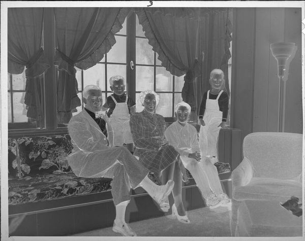 Curator: This photograph, attributed to Lucian and Mary Brown, is simply titled "Untitled (man and woman on chairs, people standing behind)." It’s a modest 10 by 12 cm print housed at the Harvard Art Museums. Editor: It feels like a faded memory. The inversion of tones lends a spectral air to the wedding party, unsettling yet somehow touching. Curator: Indeed, the negative's materiality emphasizes the photographic process itself. Who were these people, what was the labor involved? How does the image reflect social conventions? Editor: It's a poignant reminder of the ephemeral nature of such occasions, as fleeting as a photographic exposure. Curator: Perhaps. It prompts reflection on image making, family, and memory. Editor: Yes, even the simple act of viewing becomes an act of remembering, or imagining, histories unknown.