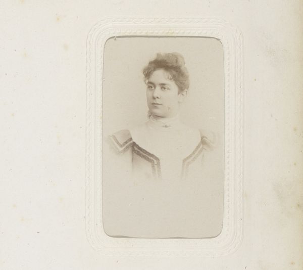 Curator: Before us, we have a gelatin-silver print simply known as "Portret van een zittende vrouw in een gestreepte jurk," or "Portrait of a Seated Woman in a Striped Dress." It was created around 1869. Editor: It has a remarkable ethereal quality; the tonality creates an impression of fragility. The narrow depth of field isolates the sitter from her surroundings and her gaze captures the viewer. Curator: These early photographs offered a new mode of representation. They were both documentary, capturing likeness, but also performative. Sitters would dress up, pose in particular ways that signaled class, education, and morality. In the case of a woman, this meant communicating domesticity. Editor: I see this particularly in the way she supports her head with her hand. I think it indicates refinement but could be viewed as conveying melancholy or simply reflecting the protracted stillness of early portrait sittings. What stands out for me is the rhythm and structure created by the stripe of her dress. Curator: Her fashion is interesting. The 1860s saw an explosion of pattern. Also, these were mass-produced photographs, making them more accessible than painted portraits. They offered a democratizing influence on how people presented themselves to the world. Editor: It seems to freeze the subject outside of time. The framing draws your attention. In some ways, she feels disconnected. There are compositional echoes of Dutch portraiture that add a visual cadence. Curator: Indeed. Photography adopted conventions and tropes of portraiture from painting and adapted it for the rapidly expanding middle class. What we're looking at here is a collision of new technology, social aspirations, and the democratization of art. Editor: Well, it certainly creates a visual tension that remains compelling. You are given space to imagine this sitter.