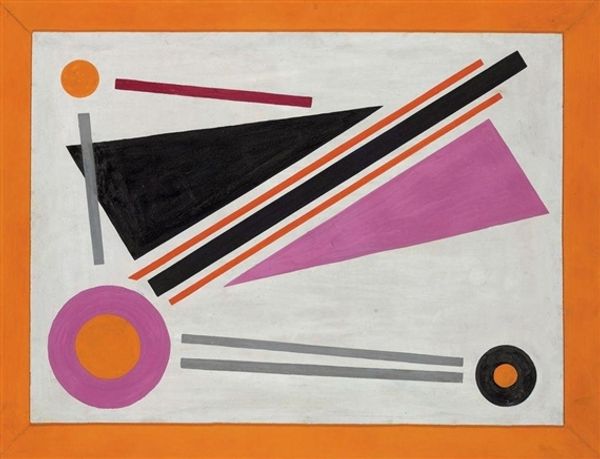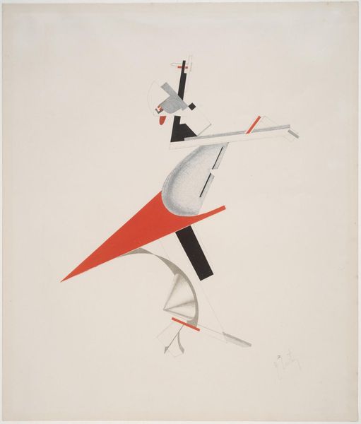 Editor: Here we have El Lissitzky's composition "5. Globetrotter (in Time)." It's a dynamic arrangement of geometric forms. The color palette seems quite limited. What strikes you most about its formal qualities? Curator: The visual elements articulate a sophisticated interplay between surface and depth. Observe how Lissitzky juxtaposes planar shapes with linear structures, thus initiating a visual tension. Editor: A tension that seems ready to topple over! But I suppose that is the point? Curator: Precisely. Consider the strategic placement of the black circle at the base; it functions as both an anchor and a point of departure for the upward thrust of the other forms. Editor: So the whole thing is a balancing act? The piece comes across with more intention now. Curator: Indeed. The composition utilizes the interplay of line, shape, and color to create a dynamic visual experience.