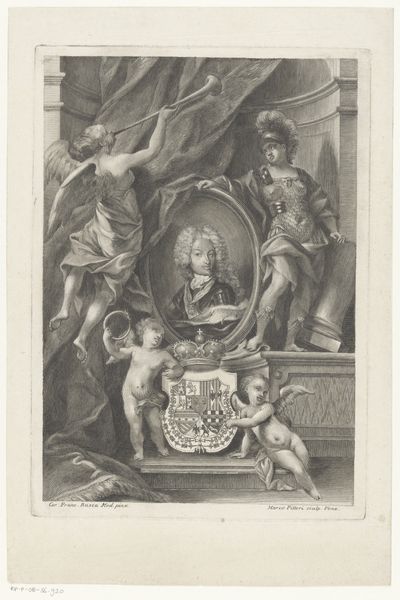 This allegorical portrait of Johann Joachim von Sandrart was made by Johann Jakob von Sandrart in the late 17th century. It's an etching, a printmaking process that relies on the corrosive action of acid to create lines in a metal plate. Look closely, and you'll see a network of fine, precise lines. These were incised into a prepared metal plate, likely copper, with a sharp tool. The plate would then have been submerged in acid, which bit away at the exposed lines. The longer it was submerged, the deeper and darker the lines would be. Ink is then applied to the plate and wiped away from the surface, remaining only in the etched lines. Finally, the plate is pressed onto paper, transferring the image. The skill involved in etching lies in controlling the acid's bite and manipulating the lines to create depth, texture, and tone. This print isn't just an image; it's a testament to the engraver's mastery of materials and processes. It reminds us that even in seemingly "flat" artworks, materiality and making play a crucial role.