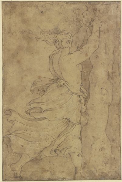 This drawing, "Female Warrior Crushing a Satyr," was made by an anonymous artist, using pen and brown ink, with blue wash, over black chalk. Consider the labor involved in this piece. Pen and ink drawings demand precision and control. The artist carefully built up the figures, using cross-hatching to create shadow and volume. The application of the blue wash is particularly interesting, softening the sharp lines of the ink and adding depth to the composition. This combination of techniques suggests a trained hand, someone familiar with the conventions of academic drawing. Yet, there’s a raw, almost visceral quality to the image. The subject matter, a powerful woman dominating a mythical creature, speaks to themes of power and control, and possibly to the social dynamics of the time. The physicality of the drawing—the pressure of the pen on paper, the layering of washes—mirrors the very act of crushing depicted in the scene. It reminds us that even in the most refined art forms, the physical act of making is always present, connecting the artist's hand to the final image.