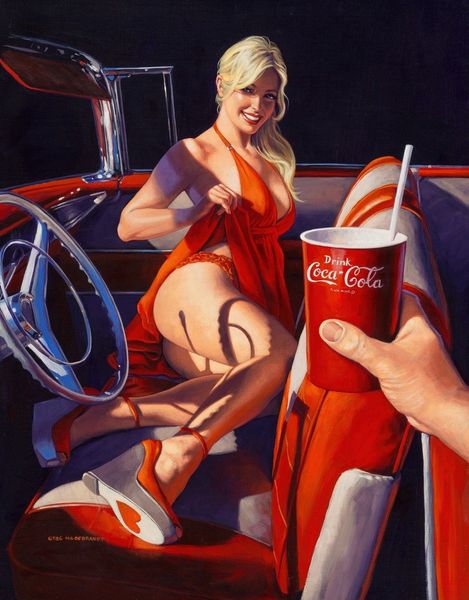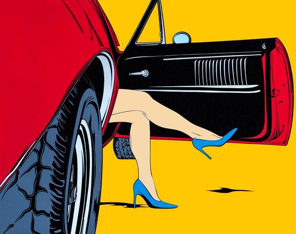 Curator: Well, hello there! This eye-catching work is "Grease Monkey" by Greg Hildebrandt, painted in 2008 using acrylics in the plein-air style. Editor: It certainly grabs your attention. My immediate thought is… Cheesecake! Is that a '57 Chevy? This definitely harkens back to those vintage pin-up calendars, with a playful yet suggestive nod. Curator: Indeed. Hildebrandt expertly uses the visual language of the mid-20th century, merging the imagery of cars and pin-up models into an updated version of familiar cultural iconography. Notice how the open hood of the car mimics her suggestive pose? Editor: I do now. I see the ways the artist used the cultural fascination with cars to sell idealized womanhood, but I find it hard to ignore the blatant objectification at play here. Curator: Perhaps. But I also see a reclamation of that imagery. This "Grease Monkey" figure has a clear visual heritage of strong, seductive icons like Rosie the Riveter. The symbols have become twisted, reflecting a nuanced history of female empowerment. Editor: That is a fascinating read. Even the open hood of the car takes on an alternative symbolism. Historically, cars symbolized progress, escape, and individual freedom, yet now they may symbolize an ecological concern that is actively threatening our species. Curator: Quite astute! The tool she’s holding certainly becomes a visual metaphor in your interpretation, a symbol for solutions or, potentially, further pollution. Hildebrandt, likely intentionally, creates tension through the contrast and ambiguity of the presented motifs. Editor: Which, of course, raises the fascinating question: how will viewers decades from now interpret it all, viewing it through yet another socio-political lens? Curator: And with that, we’ve come full circle: Symbols are fluid and contingent, shifting meaning depending on how and by whom they are consumed. It’s precisely that open quality that makes them such enduring sources of cultural insight. Editor: Indeed! Art forces us to think critically about what was, what is, and, importantly, what will be. And that is no small feat!