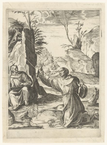 Editor: This engraving, "Christ on the Mount of Olives," made by Chrispijn van den Broeck in 1571, is striking, not only for its delicate line work, but also for the contrasting emotions portrayed. I’m intrigued by how it all comes together within a circular frame. What jumps out at you when you look at it? Curator: Immediately, the symbols speak volumes. Consider the chalice offered by the angel to Christ. It's a potent image, loaded with the weight of sacrifice, prefiguring his impending suffering and death. Do you notice how the disciples are rendered? Editor: Yes, they seem unaware and completely consumed by sleep. It's a strong visual contrast with Christ's focused prayer. Curator: Precisely. Their slumber isn't merely physical; it represents a deeper spiritual unawareness. It symbolizes humanity's struggle to stay awake to the divine. Look at the approaching figures at the gate, the details indicating their role, and consider them in relation to the sleeping disciples. Editor: The impending betrayal looms, a dramatic tension emphasized by their oblivious sleep. Are there other cultural symbols at play here? Curator: Indeed. The Mount of Olives itself holds significance. It's a place of prayer, but also of profound solitude and spiritual testing. This setting would be recognized by the intended audience and resonate with shared beliefs. Editor: This gives me so much to think about – I hadn't considered the sleeping disciples as anything more than background before, but seeing their cultural significance brings a new richness to the composition. Curator: Recognizing these symbols unlocks deeper layers of meaning and invites us to consider the universal themes of faith, sacrifice, and human fallibility that the piece embodies.