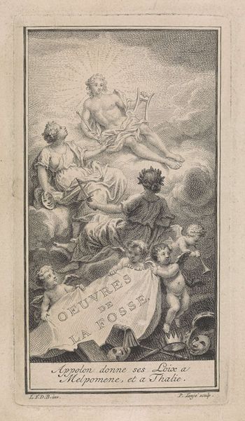 Gerard van Nijmegen created this title page for a book of colored drawings, using pen, watercolor, and graphite. The composition arranges itself asymmetrically around a central, garlanded text field. This structural layout pulls our gaze in multiple directions: upward toward the allegorical figures nestled in clouds, and downward toward a contrasting abundance of fruit arranged at the bottom. Nijmegen expertly uses color to differentiate these zones. The pastel hues of the figures above evoke lightness and airiness, while the darker tones anchoring the fruit create a sense of grounding and weight. This contrast isn't merely decorative; it suggests a dialogue between the ethereal realm of artistic inspiration and the tangible world of natural forms. It's a subtle invitation to consider how art mediates our understanding of the world. The work does not offer a singular, fixed interpretation, but continues to invite inquiry and contemplation.