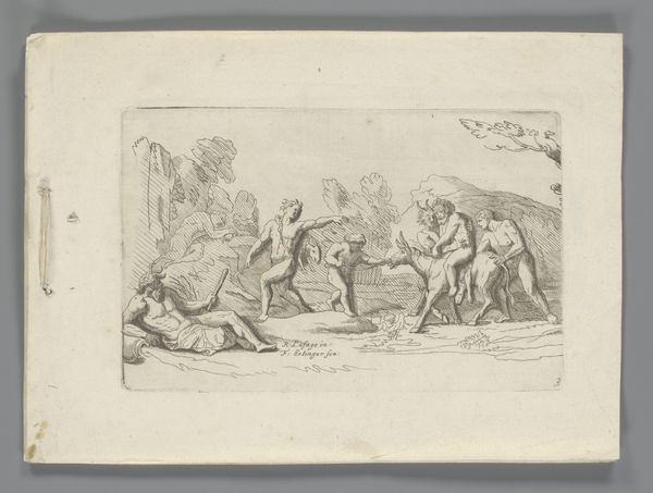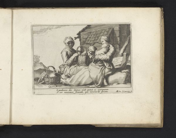 Louis Spirinx created this small etching, "Five Drunkards in a Landscape," capturing a timeless scene of revelry and excess. The central motif, of course, is intoxication, depicted through slumped figures, overflowing jugs, and unsteady gestures. Consider the image of the overflowing vessel. It echoes across centuries, from ancient Roman bacchanals to medieval allegories of vice. Here, the jug spills its contents, mirroring the loss of control and reason. The image taps into a primal fear: the dissolution of self. We see it even in contemporary depictions of uncontrolled emotion. This motif's continuous reappearance speaks to humanity's enduring struggle with its baser instincts. The emotional power of the image lies in its unflinching portrayal of vulnerability. It engages viewers by touching upon deep-seated anxieties and desires, stirring subconscious recognition. And so, the image, like the flowing wine, spills across time, ever-changing yet always recognizable, a potent symbol of human experience.