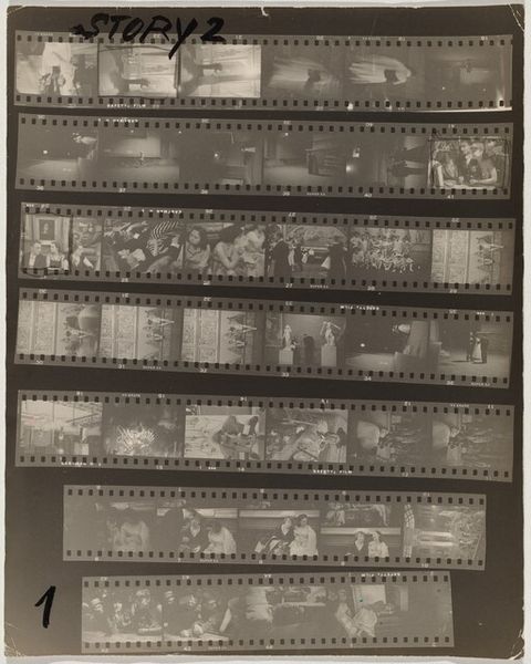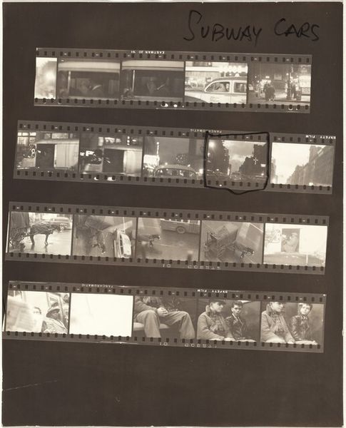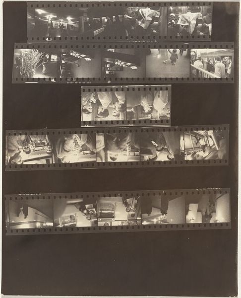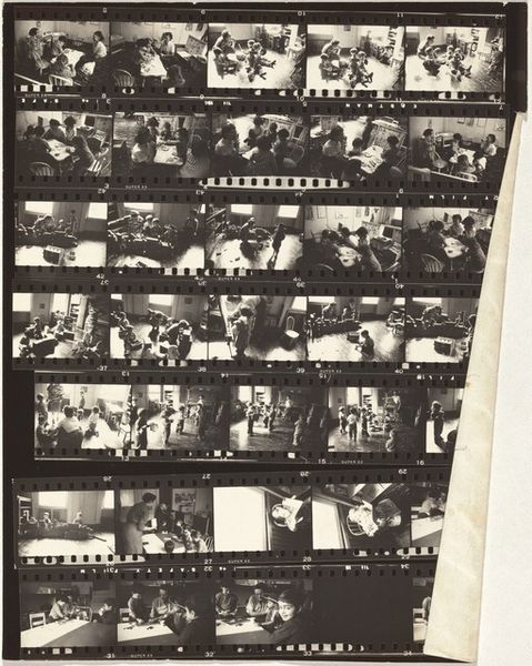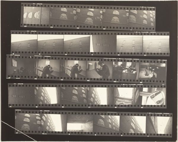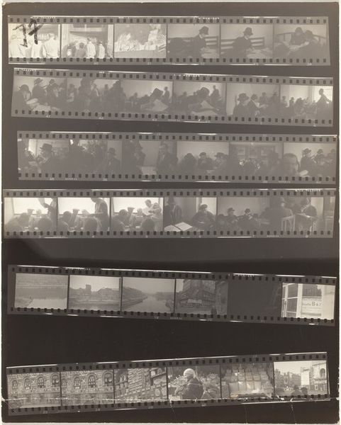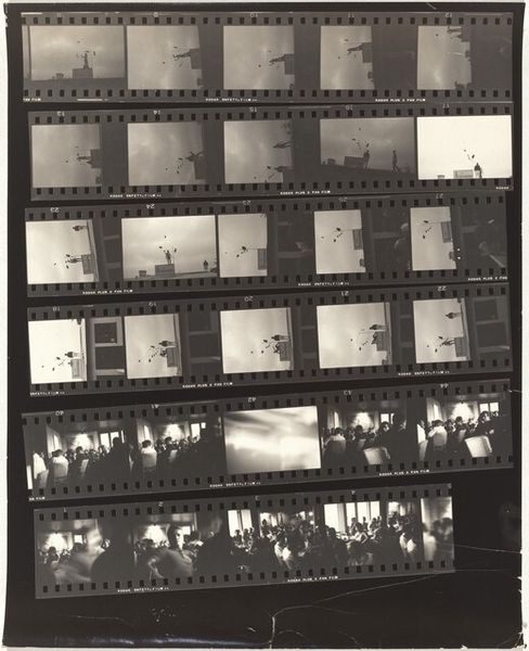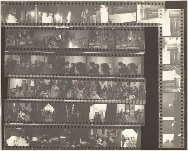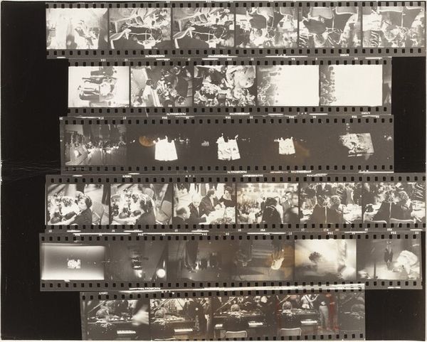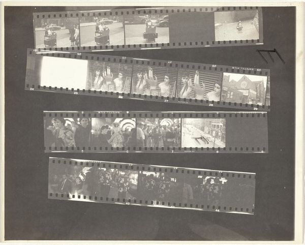 Editor: Here we have Robert Frank’s gelatin silver print, "Kennedy inauguration no number," from 1961. It’s a contact sheet, a collection of moments captured at what looks like a formal event. The whole sheet, presented like this, makes me feel like I am given access to what goes on backstage, almost raw material ready to become History. What strikes you about this work? Curator: Well, this isn’t the typical heroic imagery we often associate with JFK’s presidency, is it? Frank gives us something far more complex. The use of a contact sheet does exactly what you mentioned: destabilizes any single, iconic image. Consider that Frank, a Swiss-born Jewish photographer, was documenting America during a period rife with social and political tension. How do you think his position as an outsider shaped his vision? Editor: I guess it made him less likely to reproduce the expected patriotic images. Maybe he was interested in the in-between moments, the anxieties lurking beneath the surface of this carefully constructed image of power. It’s interesting how this one image encompasses a wider historical perspective. Curator: Precisely! And what does it say about power if Frank shows the 'backstage', or better said, behind-the-scenes? Also, this aesthetic, the supposed 'poor quality' that we can see by means of contrast, shadows and granularity became part of the artistic photography of the 20th century as a claim for freedom of speech. Would you agree with me if I suggested this picture unveils and shakes up the idea of perfection? Editor: I agree with you completely. I hadn’t thought of it that way. This makes me want to explore more of Frank’s work. It seems that photography goes beyond mere representation of power and encompasses criticism of that very power dynamic. Curator: Exactly. And, as you said, in an extremely creative way, by showing images not originally intended for being viewed or exhibited. So, by unveiling the images, Frank unveiled something more, a sign of his times.