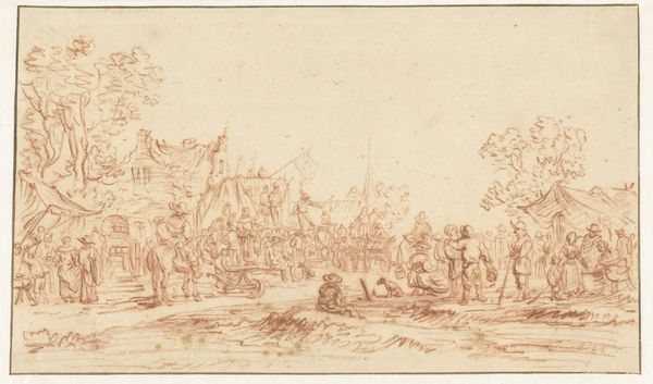 Joannes Bemme created this etching, titled "Inname en plundering van een stad door Franse troepen," using the intaglio printmaking process. The artist would have painstakingly used a sharp needle to draw this scene into a copper plate, then applied ink which would seep into the etched lines, before being pressed onto paper. The controlled lines and tonal range in the print emphasize the chaotic scene depicted. Notice how the etching captures the emotional charge of the event, a city being captured and plundered. The material process of etching, with its reliance on skilled handwork, contrasts sharply with the destructive actions of the soldiers. The labor-intensive process underscores the human cost of war and conflict. Bemme challenges us to consider the relationship between artistic creation, labor, and the broader context of social and political upheaval. It's a powerful reminder that artmaking and the means of production are intertwined with the human experience.