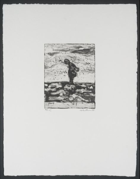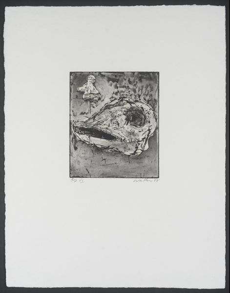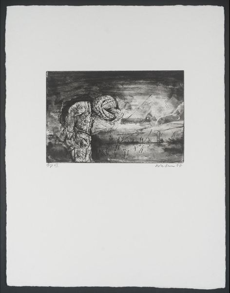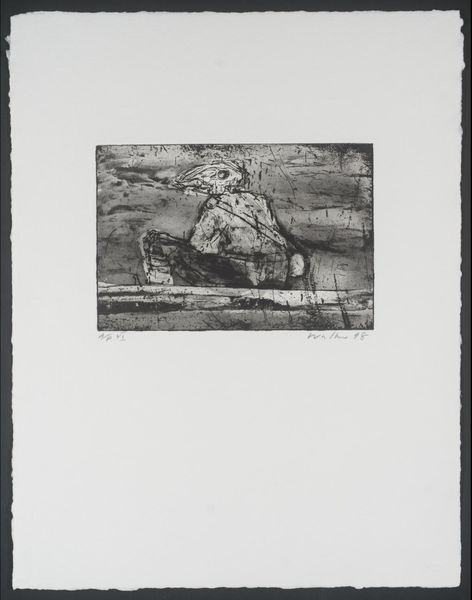Curator: Here we have an untitled etching by John Walker, made in 1995, currently held at the Tate. Editor: It has a primal energy, doesn't it? The rough, almost violent scratching of the plate, and the stark contrast between light and shadow, suggests something being unearthed, something ancient. Curator: Walker was deeply interested in the role of abstraction after Abstract Expressionism. He often combined it with figuration. This image relates to his series on Alvarez, drawn from Samuel Beckett’s play. Editor: The figure's skull-like head and the contorted pose resonate with religious iconography of death. It almost suggests a fallen saint or a forgotten deity stripped of its power, returning to dust. Curator: Perhaps, but I see the work also as a critique of institutional power. Walker was interested in how the figure could become an instrument of socio-political commentary. Editor: Whether saint or symbol of power, it's the rawness that speaks. This isn't about clear narratives but about evoking a deeper, almost subconscious reaction. Curator: Ultimately, the print embodies Walker’s explorations into the intersection of form, content, and the political landscape. Editor: Yes, a landscape of the psyche as much as society, etched in ink.