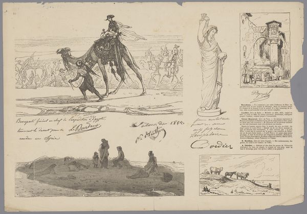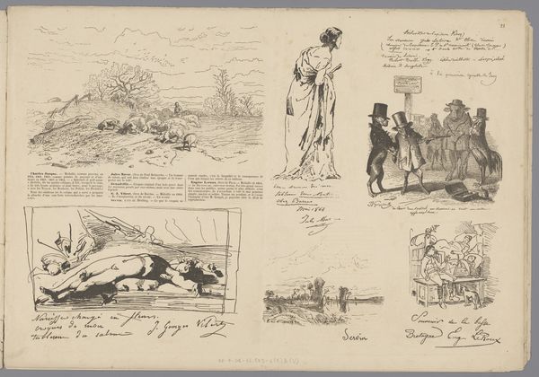 This lithograph, made by Firmin Gillot, presents a combination of figures and landscapes, rendered with remarkable detail and sensitivity. The lithographic process allowed Gillot to capture the texture of the costumes and the atmospheric perspective of the outdoor scenes. Lithography, unlike earlier printmaking techniques, relies on the chemical repulsion of oil and water to transfer an image from a stone or metal plate to paper. The artist draws directly onto the plate with a greasy crayon, and the non-image areas are treated to repel ink. This directness allowed for a more spontaneous and painterly effect, evident in the fluid lines and tonal variations seen here. The lithograph facilitated mass production of images, making art more accessible to a wider audience. Gillot’s skilled manipulation of this technique highlights the intersection of artistic expression and industrial innovation, blurring the lines between fine art and commercial reproduction. It encourages us to consider the social and economic contexts that shape artistic practice, and the ways in which technology can democratize access to art.