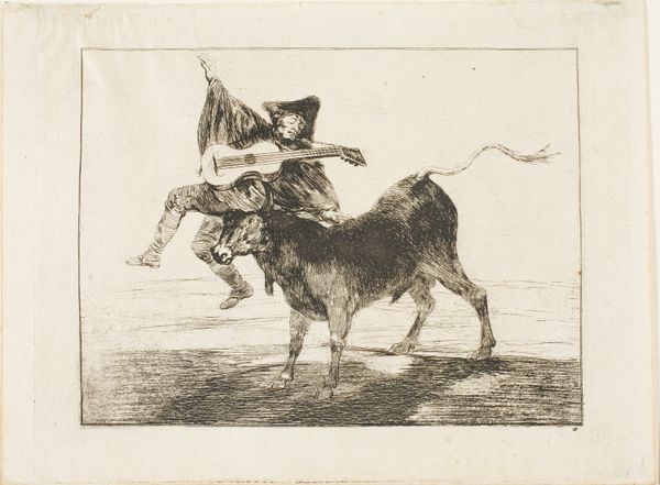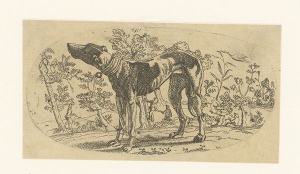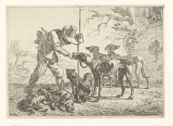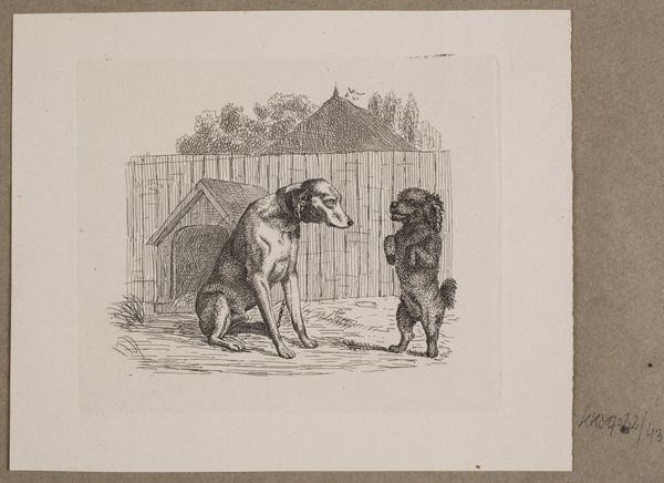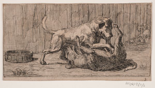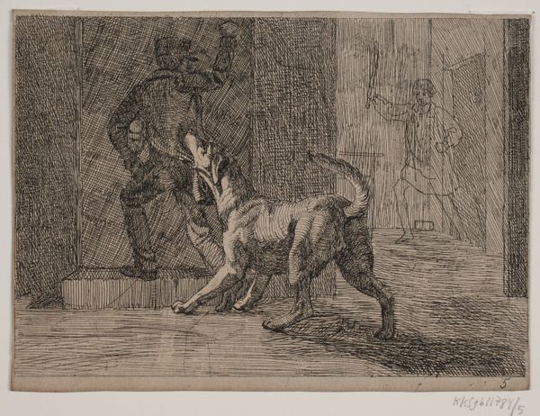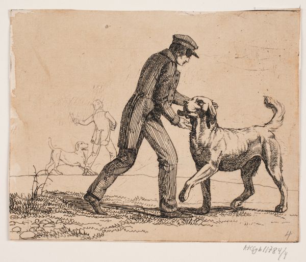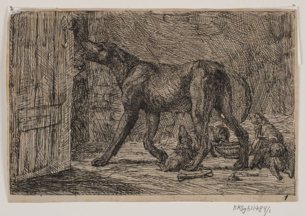 Curator: Before us, we have Lorenz Frølich's "Billede 3", created in 1838. It's an engraving, currently housed at the SMK – Statens Museum for Kunst. Editor: Immediately, I'm struck by the energy, though subdued. The linework suggests a quickness of hand, capturing a fleeting moment of domesticity. The expressions on the animals are priceless. Curator: Indeed. This engraving provides a snapshot into 19th-century Danish genre-painting, depicting a boy with his dogs, perhaps in a playful scenario. We can examine the power dynamics present – how control is asserted, learned, or resisted through these interactions with animals who often are reflections of social order and hierarchy. Editor: Absolutely. Looking at the scene symbolically, the dogs at the ready indicate watchfulness or anticipation. There's almost a contrast between the dogs’ dynamism, versus that stoic cat, positioned as guardian of its threshold. The entire scene invites associations of guardianship, protection. Curator: And don’t forget the setting. That threshold, the step – the liminal space. Who is welcome here and who is excluded? Are the figures negotiating these boundaries or reinforcing them? We should consider how depictions of childhood innocence were often deployed to idealize national values, and this engraving seems rife with encoded social meanings. Editor: True. Consider the gaze of each animal – the dogs and the cat observe specific sightlines within this imagined arena, and their expressions could hold an allegorical message for human emotions, their postures representing a range of attitudes. Perhaps Frølich is examining the perceived divide between domestic bliss, and unknown obstacles. Curator: By interrogating these everyday scenes, and revealing what they may represent regarding social codes, expectations, or national identity, we may start new perspectives regarding both present realities and remembered ones. Editor: Agreed. Engaging with Frølich’s engraving unveils how the visual vernacular transmits potent symbols. Its charm opens pathways towards a richer exploration of social interactions.