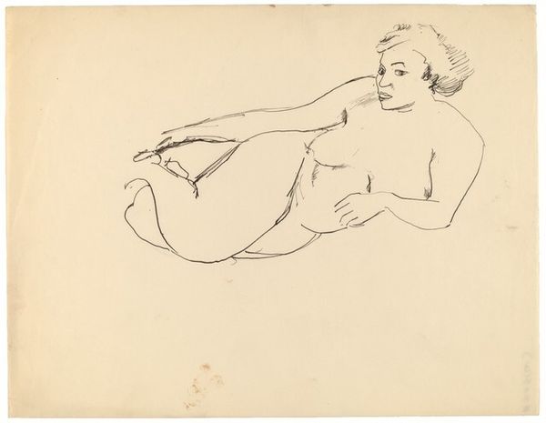 Curator: Here we have "Female Nude Lying on Back, Leaning to the Right," a pen and ink drawing by Mark Rothko. The date of execution is unfortunately unknown. Editor: It strikes me as immediately intimate. There's a vulnerability in the pose and expression. A classical odalisque turned on its head; rather than posing serenely, she almost seems caught off guard. Curator: I'm drawn to the economy of line; notice how Rothko uses simple contours to suggest volume and depth, eschewing any elaborate modeling. The figure's form is implied, not rendered. It is a distillation of form to its most essential elements. Editor: Indeed, it echoes the simplification we see in other symbolic representations of the reclining nude throughout history – a figure linked to ideas of fertility, pleasure, and even death in some cultures. The lines, so simple as to feel almost hasty, paradoxically underscore the enduring weight of this motif. But where, culturally, is Rothko situating the figure? Curator: Note the orientation of the figure in relation to the page itself: slightly diagonal, which prevents the image from becoming static. Editor: You’re right! The subtle angling creates a sense of dynamism, challenging the more static pose often expected in this imagery. But if we accept the reading as symbolic of something beyond itself – and I think we must – what symbols did the artist deploy? Curator: Symbols of a human. This seems to be, at the base, a study of essential human existence. Consider how Rothko would later further reduce figuration in his mature abstract work. It foreshadows, perhaps, a life-long reduction to only those things necessary for an impactful statement. Editor: So in its starkness, it prefigures a move toward archetypal forms, stripped bare. Perhaps it acts as a raw confrontation with the fundamental symbols we project onto ourselves and others. The joyfulness is not really happiness; it is… existing. I do appreciate this. Curator: A compelling interpretation. It has been a pleasure analyzing the symbolic forms, even in their starkness. Editor: And I am reminded of how lasting motifs continually reflect back the complex narrative of human identity itself.