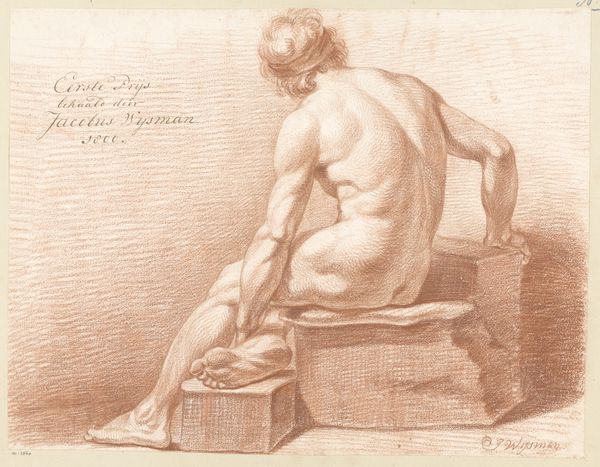 Editor: We’re looking at “Zittend mannelijk naakt, op de rug gezien,” or "Seated Male Nude, Seen From the Back," by P. Luypen, possibly from 1809. It's a pencil drawing that has a subdued and somewhat melancholic mood, don't you think? How do you interpret this work within its historical context? Curator: The beauty of Neoclassical art often masks a complex web of power dynamics. What do you make of this almost standardized pose? Is it simply an exercise in artistic skill, or could we see it as an attempt to idealize the male form, and by extension, male authority in a post-revolutionary world? Think about who gets to be represented, and how. Editor: So, you're suggesting that even seemingly neutral artistic choices can reflect broader social structures? Curator: Precisely. The ‘neutrality’ of academic art, as it's often called, is itself a construction. This work was a prize-winning piece. What criteria do you think were valued in awarding such a prize? Editor: Probably technical skill, anatomical accuracy, adherence to classical ideals… Curator: And what cultural values are embedded within those ideals? Masculinity, order, reason... It's all interconnected. What isn't visible is also telling, like the lack of social context. He's just a body, divorced from any narrative. It asks us to admire form over function, power over personhood. Editor: I see. It's about looking beyond the surface to uncover the underlying ideologies at play. I'll never see another nude sketch the same way again! Curator: Good! That is what art should do - unsettle, provoke, inspire questioning of everything we think we know. The goal is to unearth the assumptions behind aesthetics.