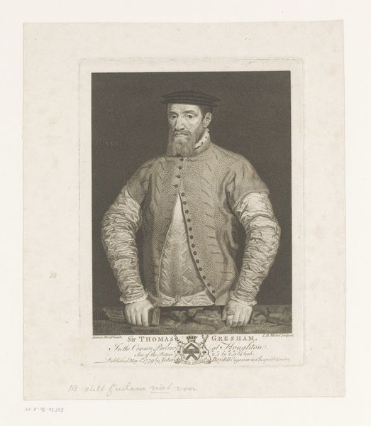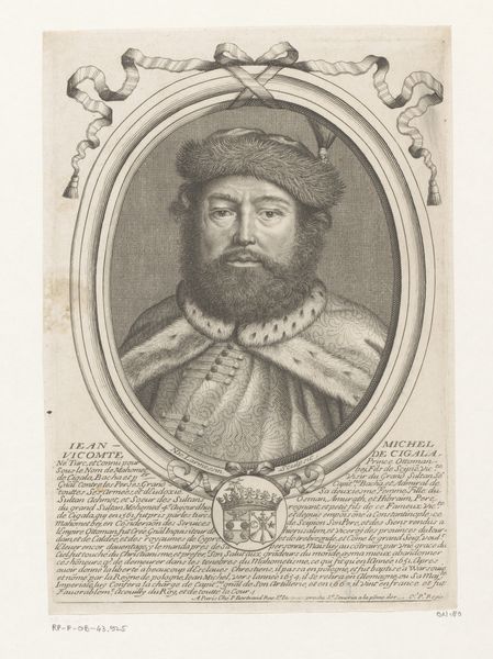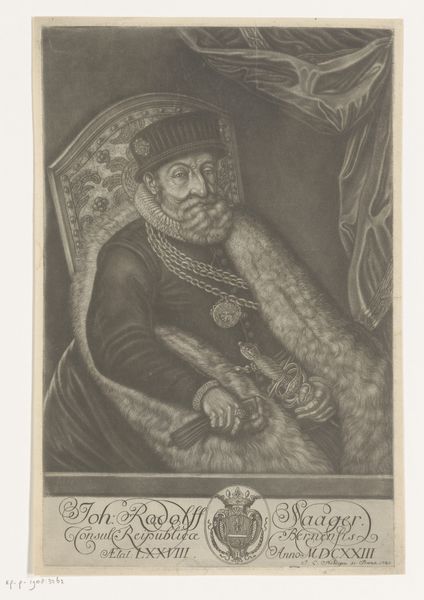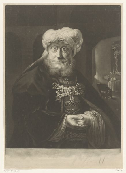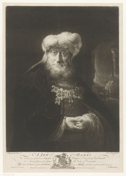 Curator: Immediately, the man’s direct gaze grabs me. There's a weight in his expression, an acknowledgement of his position perhaps? Editor: This piece, created around 1768, is a portrait by William Pether titled, rather enigmatically, "Portret van een onbekende man uit Venetië" - "Portrait of an Unknown Man from Venice." It’s a mezzotint, a printmaking technique achieving tonal gradations rather than lines. Curator: Mezzotint...so, thinking about process, it’s about building up tone, creating that velvety texture which absolutely lends itself to portraying fine fabrics like that impressive fur he’s sporting and the flamboyant plume in his very fancy hat. Editor: Precisely. The material itself influences the perception, right? It allows Pether to showcase details of status through costume—details of wealth like that decorative cord draped over his shoulder. Look, the very labor involved in producing that kind of print would have inherently elevated the sitter's position through the conspicuous consumption of the work itself. Curator: It makes you think who exactly he was, this unknown Venetian? I sense pride, sure, but also perhaps a little world-weariness in the set of his jaw and the faint furrow of his brow. I almost want to invent a narrative for him. Imagine, perhaps he’s a merchant prince wrestling with shifting trade winds... Editor: Perhaps, but it's equally important to acknowledge that these portraits circulated within very specific social networks. Printmaking allowed for broader dissemination of imagery reinforcing existing power structures by reproducing idealized versions of the elite for the consumption of other elites. The image itself *becomes* currency. Curator: That's absolutely right! We shouldn’t overlook the role of portraiture in building power in the eighteenth century. All that detail speaks volumes. So, thinking about it from both sides, how material can reinforce narrative and the other way around. Fascinating, really.