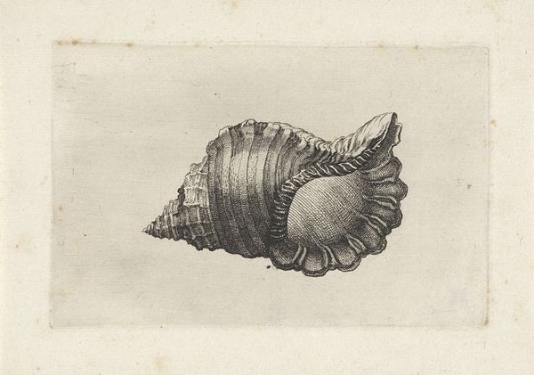 This is Wenceslaus Hollar’s “Schelp, bursa rubeta,” an etching which captures the intricate details of a sea snail's shell. Hollar, a 17th-century Bohemian artist, was known for his detailed renderings of the natural world. Considered through the lens of identity and cultural exchange, this image reflects the European fascination with the exotic during the Age of Exploration. Shells like these were collected from distant lands and brought back to Europe, becoming symbols of wealth, knowledge, and global reach. As Hollar meticulously etched the shell, he engaged with the complex interplay of science, commerce, and art that defined his era. The detailed work invites us to reflect on our relationship with the natural world. It serves as a reminder of the interconnectedness of global trade, scientific discovery, and artistic expression. What does it mean to find beauty and value in an object taken from its original context?