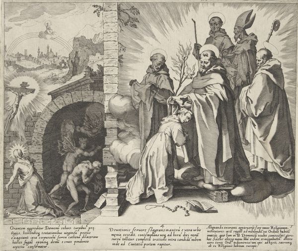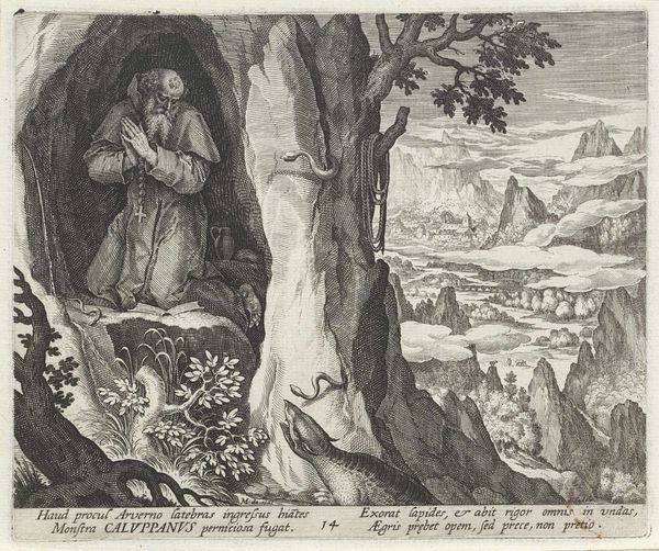 Curator: Let’s examine this print, “Johannes de kluizenaar,” or “John the Hermit,” created between 1583 and 1588, now housed at the Rijksmuseum. Johann Sadeler I executed the work using engraving techniques. Editor: The contrast! Stark blacks and whites create such a dramatic scene, almost theatrical in its staging of the figures within the rocky landscape. There’s a real weight to the lines. Curator: Indeed, the engraving emphasizes the stark reality of the hermit's life, drawing on the visual language of Northern Renaissance printmaking to situate the religious figure firmly within a landscape that is both beautiful and unforgiving. Note how the composition guides our eye— Editor: It’s almost divided in two, isn’t it? On the left, we see a hermit walking toward the viewer, further back, framed by the rocky opening; while on the right, a figure in deep prayer dominates. The artist created such intimacy for the second man while allowing the man on the left to exist more as a mirage. Curator: This contrast certainly speaks to a moment of transformation or perhaps a journey, both physical and spiritual. The setting seems meticulously constructed. The play of light across the stone textures is incredible for the time period. The very texture of this print helps evoke a specific spiritual tenor. The lines on each character create a worn, determined presence. Editor: Perhaps the engraving, beyond its overt religious subject, taps into broader debates about institutional authority, offering a sympathetic portrayal of individuals seeking truth outside established societal norms. Curator: That’s a compelling viewpoint. Thinking about this piece now in the context of shifting religious and social structures certainly gives us something new to ponder. Editor: Precisely, looking closely reveals how even seemingly straightforward religious iconography can intersect with the larger political and social upheavals.