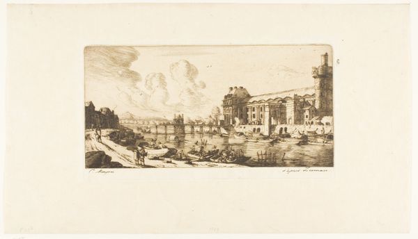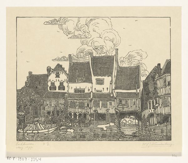 Editor: This is Joseph Pennell’s etching "Lindsay Row, Chelsea," created in 1903. The textures are incredibly detailed. It's a complex cityscape, but rendered with what feels like very economical mark-making. How would you describe the visual language used here? Curator: The piece utilizes line as its primary structural element, doesn’t it? Note how the density and variation in line weight create both form and value. The cross-hatching is strategic, adding depth without relying on solid areas. Have you observed how the artist manipulates the surface of the plate to achieve this range? Editor: I can see that now – particularly in the reflection on the water. The varying depths of the etched lines must contribute to the reflective quality, almost mimicking movement. Are there any particular areas where Pennell's technique is especially effective? Curator: Focus on the facade of the buildings, specifically the fenestration. Notice the controlled, delicate lines delineating the windows, which contrasts against the more energetic strokes in the foreground foliage and reflections. This contrast not only highlights architectural precision but also creates a visual hierarchy. What does this structural play evoke in your interpretation? Editor: I hadn’t considered the buildings in isolation like that. I suppose this careful detail forces us to pause, to differentiate and absorb each individual structure. It highlights the architecture rather than prioritizing the surrounding landscape and daily life as a unified scene. Curator: Precisely. By deconstructing the scene into structured elements – line, tone, texture – we unlock how Pennell creates a distinctly formal, albeit seemingly casual, rendering of an urban landscape. It's an analysis of visual forms. Editor: Thank you. Seeing how he uses different weights of line and hatching to build the structure makes the etching even more fascinating!