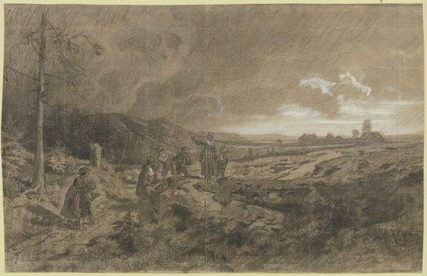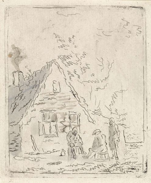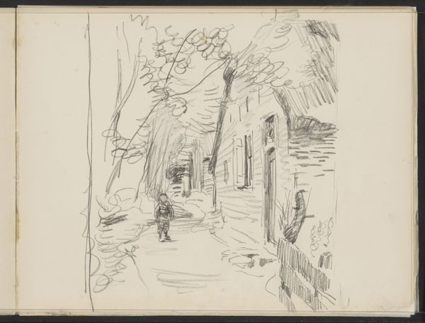 Curator: Standing before us is a pencil drawing titled "Straße mit mehreren Personen, die im Gespräch beisammen stehen," or "Street with several people standing together talking." It’s currently housed here at the Städel Museum and is attributed to Rudolf Gudden. Editor: The very first impression? An exercise in grey. A kind of beautiful melancholy woven from graphite. See how the weight of the pencil fluctuates to build form. Curator: Yes, that variance in pressure is key. It appears the architecture—the simple facade of that building on the right—is rapidly sketched, prioritizing line over perfect accuracy. What about those figures? Editor: Oh, they almost fade into the setting, don’t they? Huddling. Discussing…gossiping, perhaps. And their inclusion, their sheer presence, underscores this dance between public space and private lives. Do we know where he might have sketched this? Curator: Unfortunately, the details surrounding its creation, its precise origins, remain obscure. We can assume a public square or thoroughfare somewhere in Europe, considering his practice and location. But I love that the mystery of the place itself lends this little drawing a deeper sense of intrigue, don't you think? Editor: Absolutely. The labor involved feels intimate. Raw material meeting intention on paper in strokes…that texture implies he made this on site. Think about that social transaction– the pencil, the paper, all becoming this distilled moment of everyday life. It’s quite profound if you ask me. Curator: And perhaps Gudden wanted it to feel so…unassuming. It is precisely in this casual capturing of everyday life where we perceive its worth, where he reveals the profound value hidden within those overlooked instants. This fleeting sense that everything will remain and vanish simultaneously. Editor: True! An almost accidental archaeology…layers of meaning emerge, despite its modesty of means and scale. It hints that true artistic understanding can sometimes arise through our everyday exchanges, mundane gestures, and observations, all carefully composed using pencil.