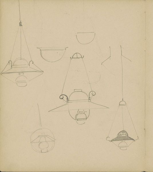 Curator: This lovely drawing, “Ontwerpen voor hanglampen,” or "Designs for Hanging Lamps" as we’d say in English, comes to us from Carel Adolph Lion Cachet. It's a pencil on paper piece dating from around 1905-1906. What’s your immediate reaction to it? Editor: It feels like stumbling across a secret inventor's notebook. It’s more playful than polished. You can almost hear the gears turning in Cachet’s mind, can't you? I imagine that this aged paper would have held numerous preliminary ideas. Curator: Precisely! The light pencil work definitely lends itself to the sense of free exploration, as well as highlighting its place in a larger Art Nouveau sensibility. Cachet, known for his decorative arts contributions, presents us with something beyond mere utility. Editor: Yes! Those initialed designs! It's as if the light itself needed a monogram, like high-end luminous stationery. But thinking about it from the angle of interior spaces and architecture from around 1905, does this sort of sketch stand out from what others were doing at the time? Curator: Absolutely, it offers an insightful reflection into the broader historical context of interior design. There's a conscious shift from pure ornamentation to integrating form and function during the Art Nouveau movement. Symbols gain importance – not merely aesthetic but hinting at deeper meanings like light, warmth, and domesticity. Editor: It's interesting how he doesn't seem stuck on one particular aesthetic, does he? Like, some are more geometric and linear, while others play with those swirling organic motifs of Art Nouveau. Each feels like a different possibility for illumination. Almost literally lighting up a new idea each time. Curator: Indeed, they reflect that transitional era where craftsmanship met budding industrial possibilities. These sketches preserve a moment of imaginative potential. They echo sentiments and expectations related to progress. Editor: Well, seeing these quirky sketches laid out like this makes me think of a hopeful gaze toward the future, too. A future full of personalized lighting! That sketchbook feel is great, don't you think? Curator: A great find to appreciate and reflect on those creative origins, definitely. Thank you for sharing your insights! Editor: Likewise, for revealing all that hidden beauty.