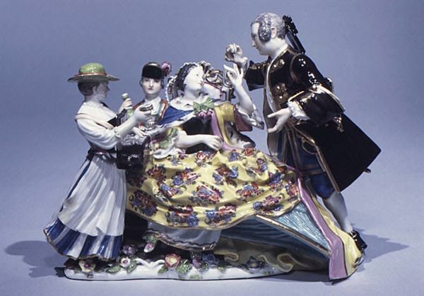 Curator: Let’s consider this captivating porcelain sculpture titled "The Handkiss," crafted around 1737 by the Meissen Manufactory. You can find this treasure here at The Met. Editor: Immediately, what strikes me is the dynamic arrangement of the figures—it's almost Baroque in its swirling energy, yet refined through the delicate Rococo sensibilities. The rich interplay of colors and textures… incredible. Curator: Indeed! The group presents a genre scene reflecting aristocratic social life. Consider the role of Meissen porcelain in the 18th century—it symbolized wealth, taste, and power, serving as diplomatic gifts or decorative objects in elite circles. Editor: Precisely! The miniature scene bursts with meticulous detail. Look at the intricate floral designs on the woman's skirt or the glints of gold tracing every edge. It almost transcends functionality, wouldn't you say? Curator: Undoubtedly, porcelain transcended functionality! What is particularly relevant is that representations like these reflect a social order—where you have a queenly figure seated on a throne, a kneeling admirer performing an act of deference, and the ever-present, enslaved servant off to the side, implicitly showing the hierarchy of labor. Editor: The figures exhibit stylized forms, certainly—notice the graceful S-curve in the woman's posture and the carefully sculpted drapery around the hand-kissing admirer. What is your assessment of this visual organization and what it communicates in and of itself? Curator: I read those aesthetic features not just as Rococo beauty, but also as evidence of carefully crafted aristocratic presentation for their elite audience. Each of the details, the poses, and the choice of subject contributes to the symbolic representation of their place in society and the display of their values and authority. Editor: It's a potent blend, really—the delicacy of the material playing against the powerful dynamics and societal tensions depicted in the scene. I find it both intriguing and somewhat unsettling, given its ornamental nature and the deep societal imbalances present in Europe at the time. Curator: That tension is exactly what makes it a key art object to study and place within the historical context of artistic, political and socio-economic realities. Editor: I concur. Thinking of it from this more comprehensive angle gives another layer of profundity to what might first be read as simply decorative.