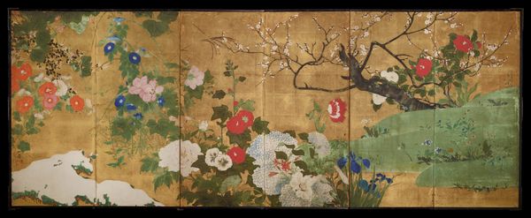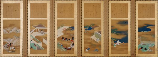 Editor: This is "Books and Scholar’s Objects," also known as "Chaekgeori," created around the 19th century. It's currently housed at the Minneapolis Institute of Art. These paintings consist of ink and watercolor on paper in a multi-paneled folding screen. I am immediately struck by its unique decorative quality. It almost looks like a collage with varying perspectives in a confined space. What visual elements stand out to you, and how would you interpret them? Curator: The treatment of space and perspective are certainly intriguing. Observe how each panel employs a flattened picture plane, almost like a shallow stage. Objects overlap and tilt, defying conventional perspective. Notice the relationship between positive and negative space, the delicate rendering of each item that flattens depth. How do you feel this affects the work as a whole? Editor: I find that it enhances its almost dreamlike, symbolic quality. Is the use of color equally intentional? The color seems intentionally limited. Curator: Precisely. The palette of red, green, and brown, contrasted against the ground, guides the viewer's eye, creating balance within each panel. The deliberate composition calls to the Western eye Cubism, but with the historical context it uses an intentionally compressed plane in order to present symbolic offerings. Do you find a particular harmony with the piece using your new understanding? Editor: Yes, definitely. Considering the compositional and color choices, the arrangement truly brings this “stage” to life. It all appears more meaningful now. Curator: Indeed. The formalism unlocks many qualities that bring meaning to the objects represented and helps place it in context. Editor: Absolutely, this was incredibly enlightening, thank you. Curator: My pleasure. This piece reveals so much when we really focus on the visual relationships between the objects themselves.