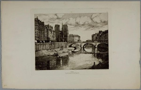 Curator: Ah, yes, Grace Albee’s etching from 1929, titled "Pont Marie." You can almost smell the river, can’t you? Editor: There's a kind of stillness, but not a peaceful one. Melancholic, perhaps? Like the city is holding its breath, aware of changes coming. Look how heavy the sky feels. Curator: It's funny you say that, because for me, it's so crisp and full of clarity, a real articulation of a very specific time and place. Look at the way she's rendered the light reflecting on the Seine, those short, deliberate strokes of her etching needle, full of rhythm. The houses are so present; all those windows must have secrets to tell! Editor: Those sharp lines definitely capture the architecture, but it also feels like a pre-war landscape. The Pont Marie has been a silent witness to so much upheaval. These structures have survived for centuries, symbols of resilience, sure, but also of the disparities that shape urban life. This bridge was at one point the springboard for social unrest and, later, political solidarity and demonstrations against police and government excesses. Curator: That’s a potent reading. I can't deny I have an almost instinctual reaction to her lines. There’s a real care there. This cityscape isn’t simply a backdrop; it feels almost like a character study in its own right. Almost like Paris is a stage setting or some type of theater. Do you think? Editor: Definitely. It highlights the theatrical nature of city life – the way urban spaces are constantly performed and re-negotiated, socially, economically, politically. The boat on the left feels loaded with history too, doesn't it? I can't imagine what all it might carry… or might have once carried. Curator: Indeed. Perhaps those bare trees along the riverbank evoke something. Albee masterfully captured that sense of place and time. The stillness, that sense of premonition... It makes you consider, what were the inhabitants thinking just before a tidal change? What would come? What would fall away? Editor: Absolutely, and situating this seemingly straightforward cityscape within the complex fabric of social and political change enriches its aesthetic power tenfold. A bridge isn’t just stone; it's connection, division, potential, constraint.