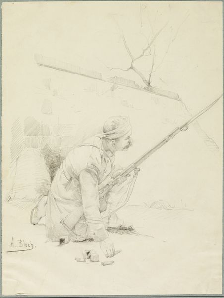 Curator: Jacob Ernst Marcus created this pencil drawing, "Kneeling Man Filling a Jug in a Ditch," sometime between 1784 and 1826. It's currently housed here at the Rijksmuseum. Editor: My first thought is how subtly melancholic it is. The pale tonality and downward gaze of the figure impart a sense of quiet resignation. Curator: It is indeed a genre scene rendered with incredible delicacy. The artist's choice of pencil allows for nuanced gradations of light and shadow. The type of pencil and the paper used give clues to the culture around drawing at the time. Was this drawing done in situ, or back at the studio, remembering a scene, for instance? The materials themselves are part of the story. Editor: Absolutely. And the jug itself— a classical form in this everyday context— evokes deeper, perhaps archetypal, connections to water, nourishment, and labor. Water is essential for every class in society, of course, but filling the jug also implies that water access requires work from common laborers. Curator: Yes, there's an undeniable class consciousness subtly woven in. This wasn't just about picturesque landscapes; it’s about showing the ordinary, the back-breaking labor involved in sustaining society, even for something as simple as water. Editor: And even the act of kneeling – a posture of deference or humility – amplifies this reading, making the symbolism more poignant. There's a spiritual connotation here, perhaps unintentional, that elevating hard, physical labor through the symbol of fetching for this necessary natural source will lead to further peace or goodness. Curator: You've got me thinking more about the role of fences, which in agricultural terms both mark ownership of lands and provide protective boundaries from animals. I can imagine that water was crucial for sustaining cattle and growing produce at the time. Editor: I concur that seeing this image through the context of ownership really illuminates what Jacob Ernst Marcus could be subtly communicating through it! What have we learned here today? Curator: The value in studying historical art through the lens of medium and class consciousness really unlocks hidden value.